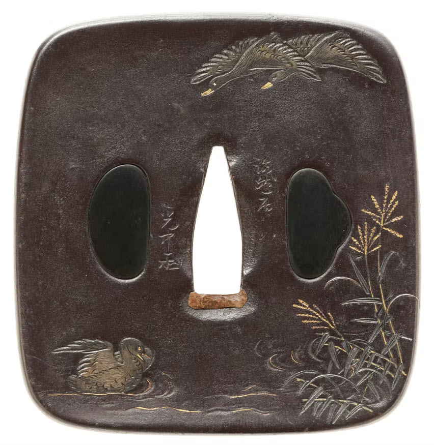 嚮山光中は鷲田慎吉と称し、多彩な色金を組み合わせた精巧で緻密な平象嵌を得意とした名工。この鐔では、鉄地を用いて晩秋の水辺の風情とし、抑揚変化のある地面を微細な石目地に仕上げて霧の起ち込めた中に主題が浮かび上がるように表現している。金朧銀の平象嵌と繊細な毛彫による芦は水に揺れるように、雛鳥を目掛けて舞い降りる雁もまた繊細な毛彫平象嵌で羽毛までも再現。裏面は芦のみで、穂を金と銀の平象嵌で描き分けているのも味わい深い。