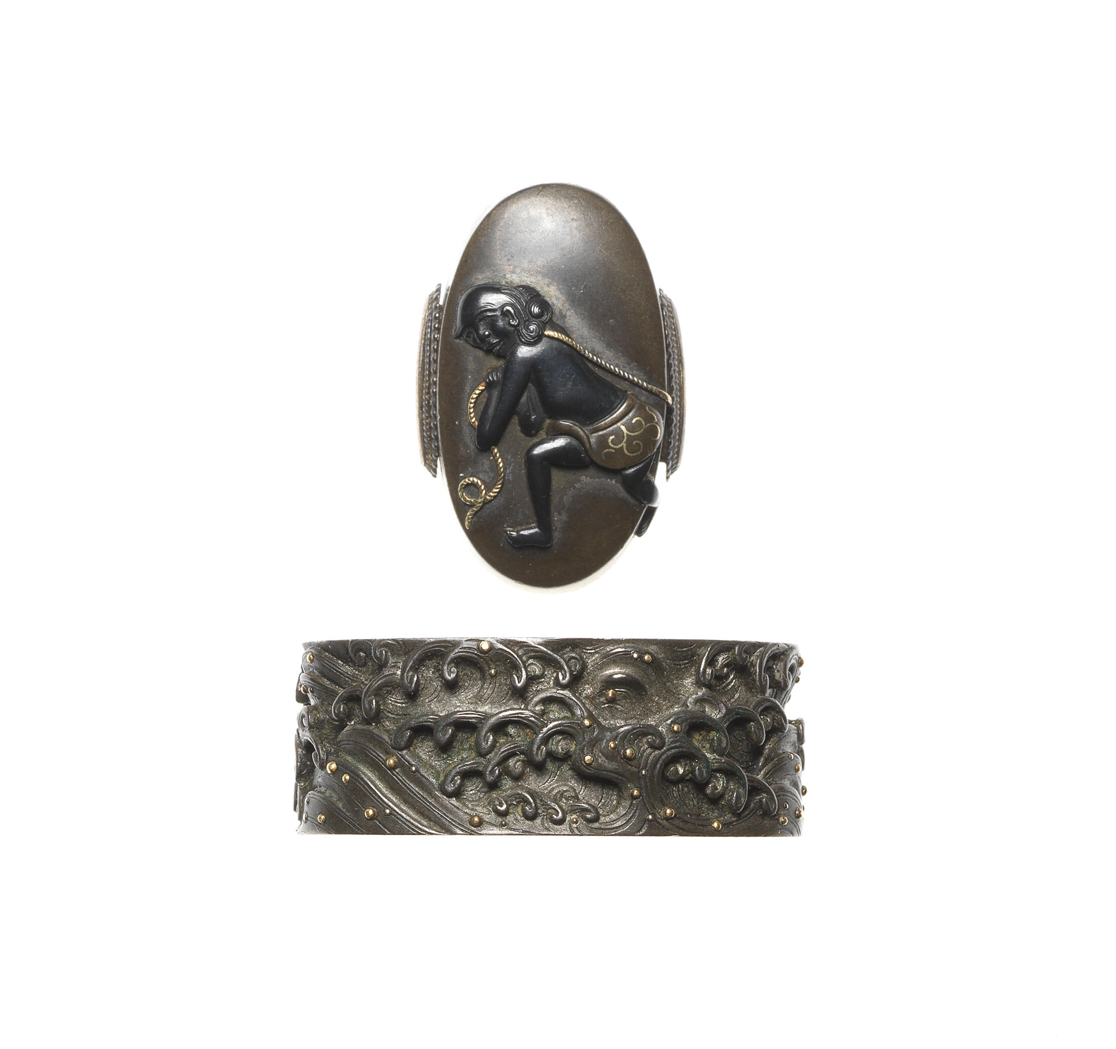 Each of shibuichi, the first having a fuchi carved in waves in typical Omori style, the kashira inlaid in shakudo with a coral fisherman, signed Omori Teruhide