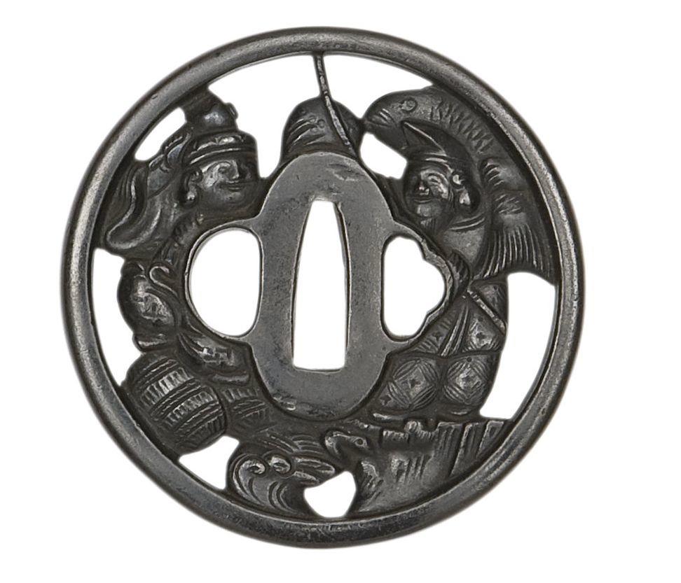 Of circular form, pierced with Daikoku and Ebisu with a bale of rice and a large fish respectively, in a wooden box