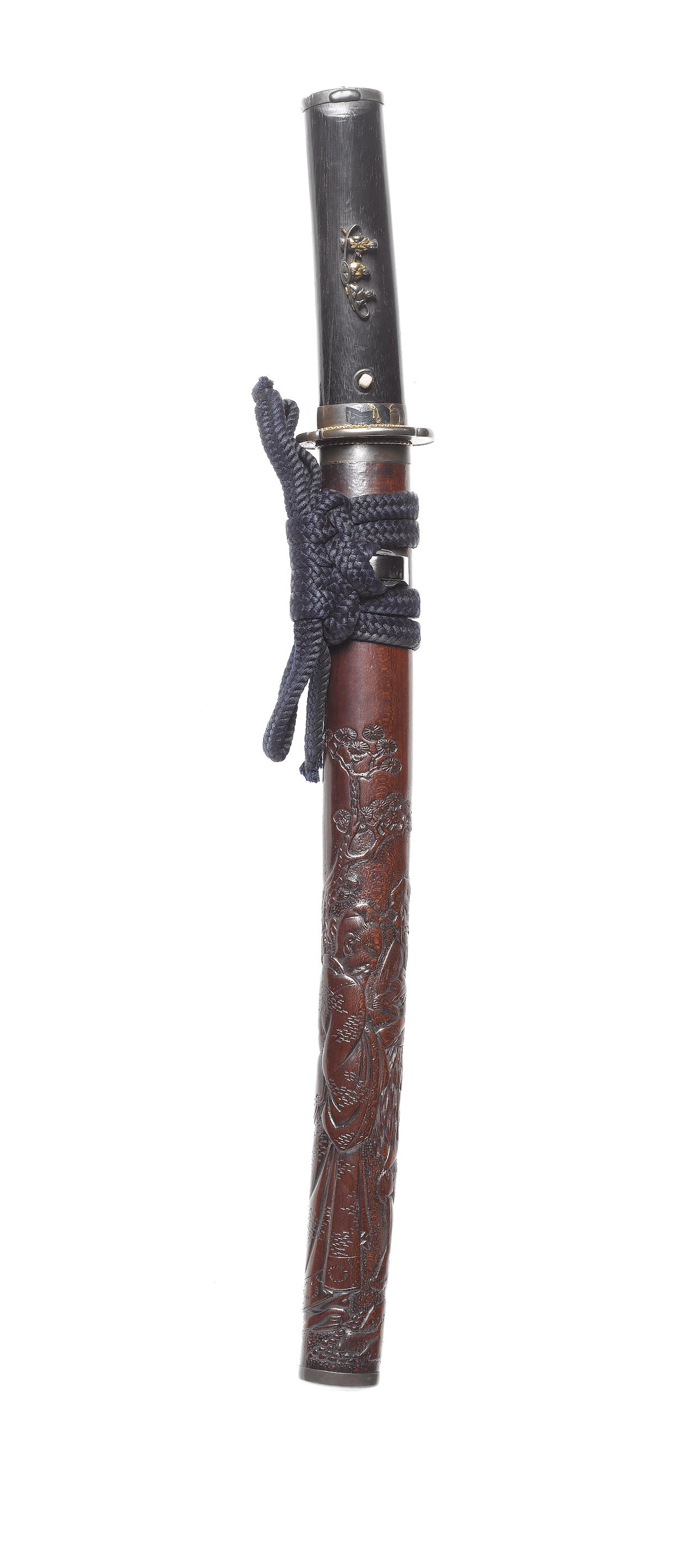 Of shallow sori form, carved in relief with two sennin engaged in conversation beside a pine tree, signed Moryusai Toshifumi (Sebun) cho with kao; with associated shibuichi fittings, the mokko tsuba inlaid in iroe takazogan with Autumn plants, unsigned; the kozuka engraved and inlaid with travellers crossing a bridge, signed Hosono Sozaemon Masamori; the fuchi-gashira inlaid with okina and a mask box, signed Toshinsai Hanmi with kao; the mixed-metal menuki each of three figures on a large waraji.