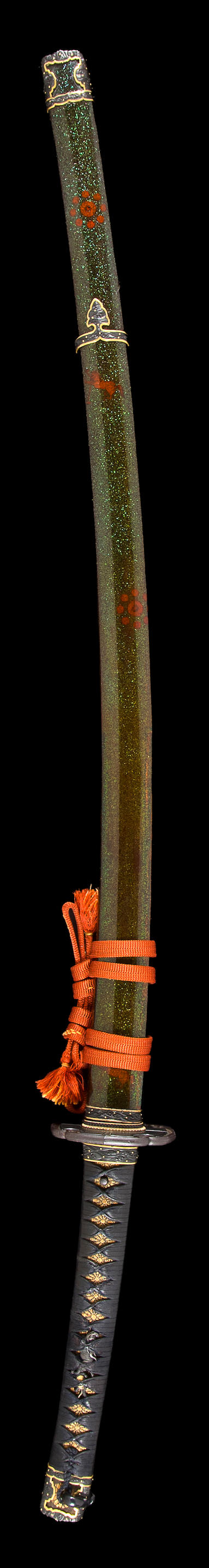 The saya designed in aogai and decorated with rearing horses and plum-blossom family crests in red lacquer, the koiguchi, seme-gane and saya-jiri shakudo and gold carved with crashing waves with gold dots of foam, the seppa and fuchi-gashira designed to match the saya hardware, tsuka wrapped with black silk over brocade and mounted with Dragon, swallow, kirin and minogame menuki in iroe takabori, shakudo and iron tachi-style mokko tsuba