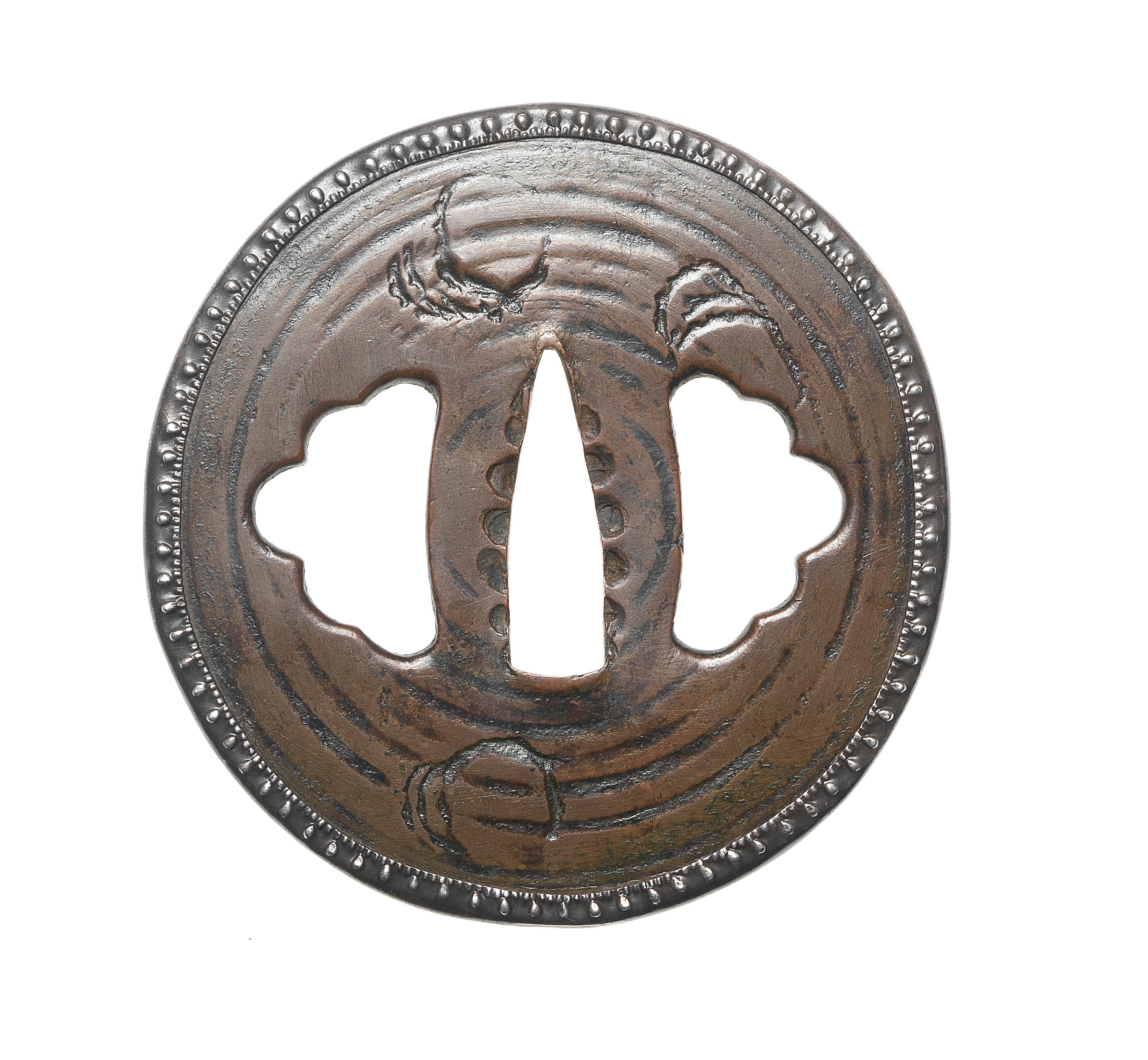 Of circular form, with beaded silver Odawara fukurin, pierced with large lobed ryohitsu and engraved with irregular scattered clouds on a ground of Okina yasuri, unsigned; with wood storage box. 7.9cm (3 1/8in). (2).
