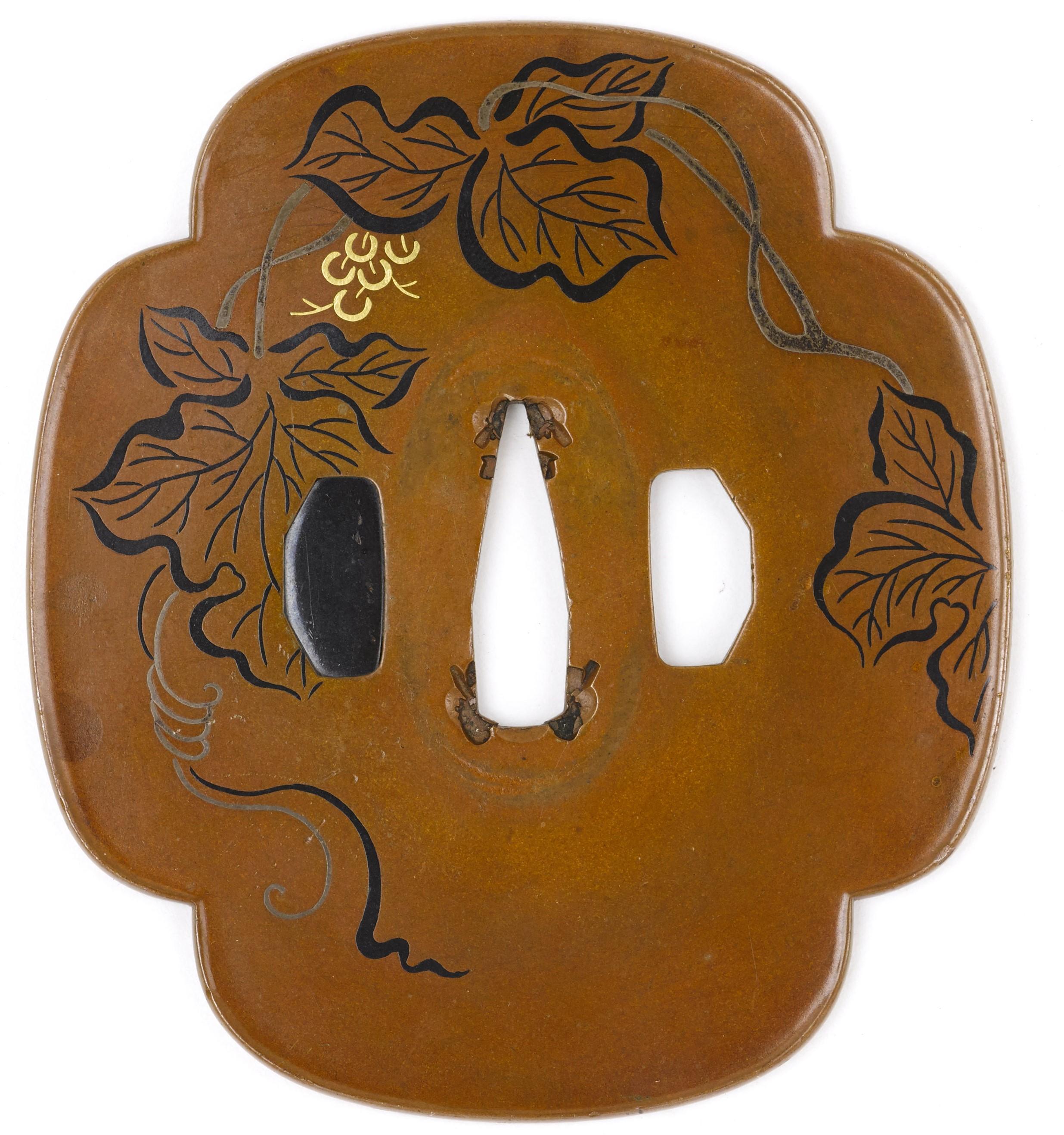 The unusually large copper mokko plate polished to a migaki finish and decorated with scrolling vines and leaves in gold, silver and shakudo hirazogan, slightly dished to the rounded rim, long six-sided hitsuana, one plugged in shakudo