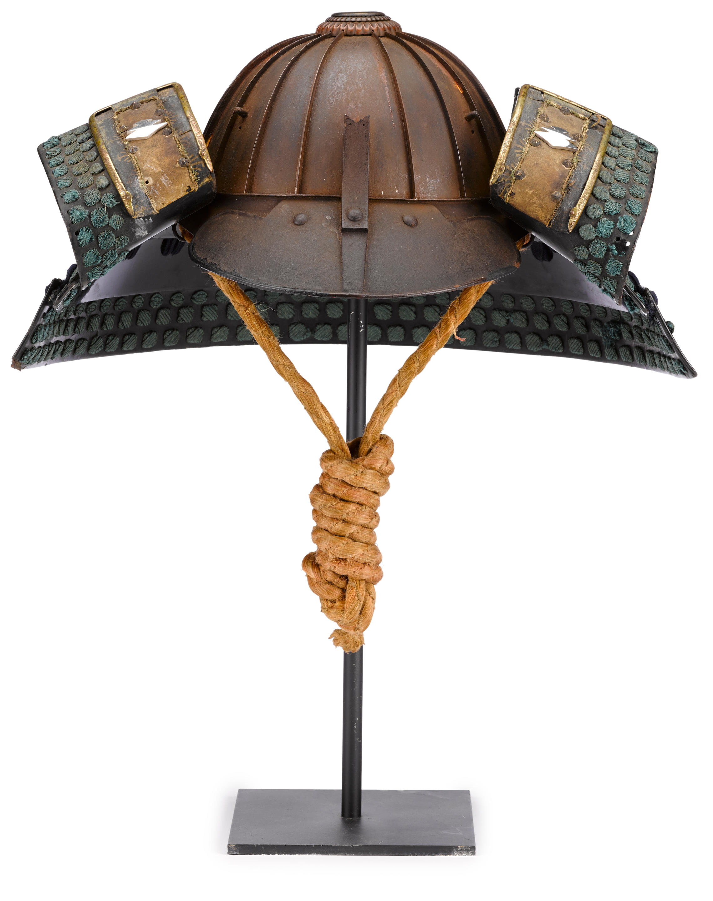 An eighteen plate suji kabuto with high standing suji and prominent file marks on the surface and finished with a two-stage copper and shakudo chrysanthemum tehen kanamono, the mabizashi with a black lacquer fukurin, the three-lame solid-plate shikoro lacquered black and laced in two shades of navy terminating in large fukigaeshi applied with stenciled doe skin, silk cord, star rivets and solid silver matsukawabishi heraldic crests, trimmed in gilt metal fukurin carved in scrolling vines, the interior of the bowl signed Hirosakiju Myochin ki Muneyoshi and dated Bunsei juni tsuchinotono ushi nigatsu (no) hi (1829.2)