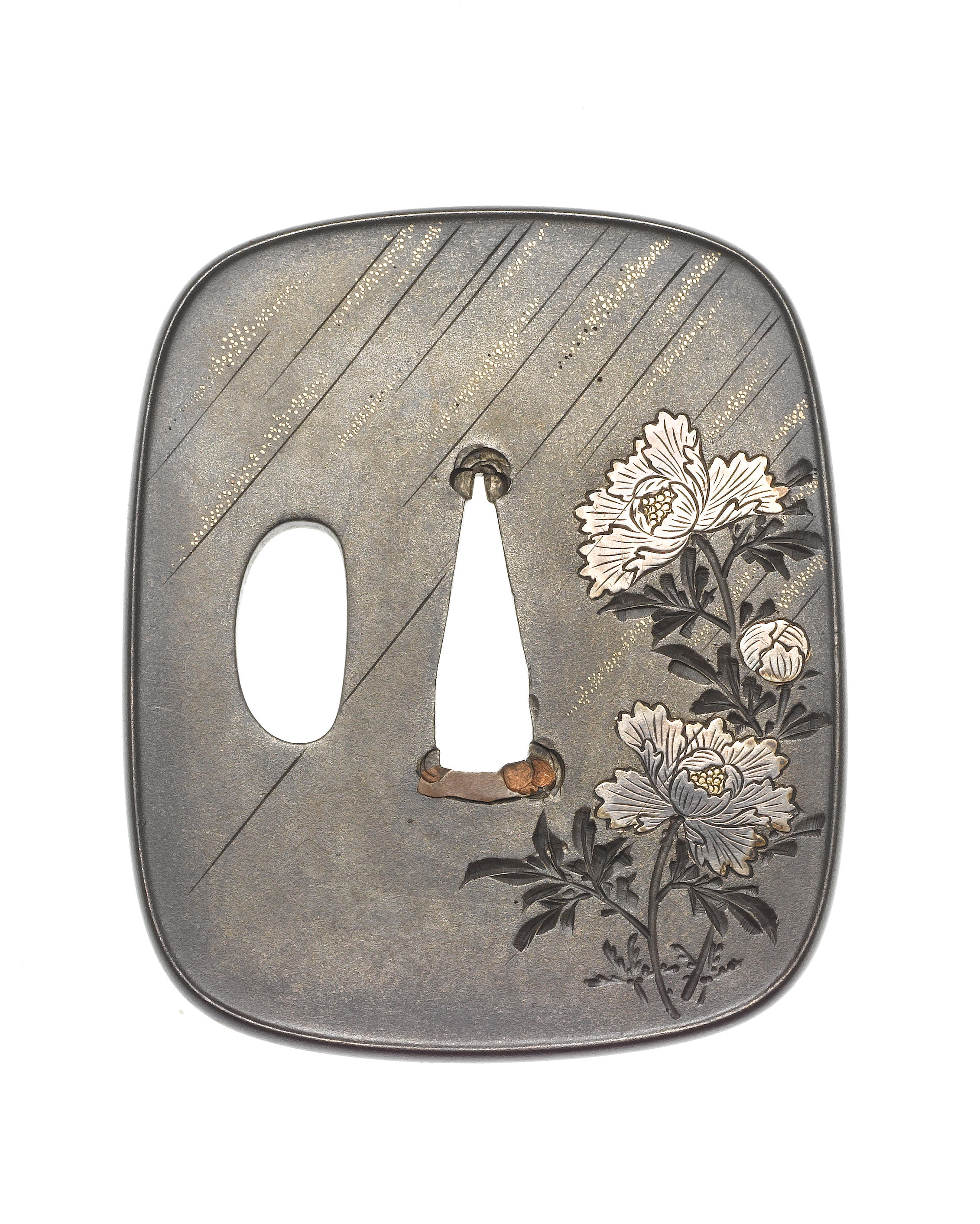 Of rounded rectangular form with raised rim, inlaid in gold and silver honzogan and engraved in katakiri with peonies in a rain shower, the reverse inlaid with three butterflies, signed Isobe Isshu with kao.