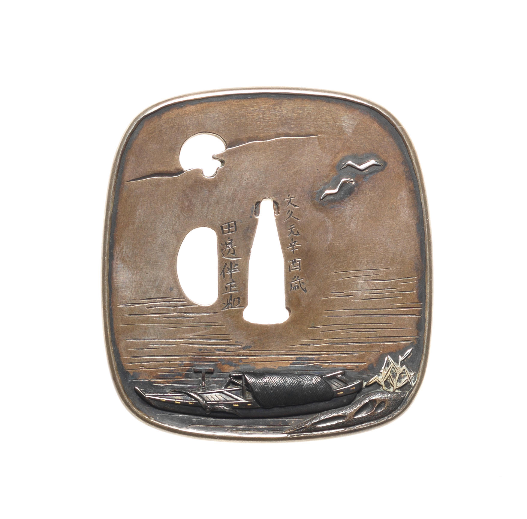 Of rounded rectangular form with shibuichi raised mimi, inlaid with a covered work boat moored among reeds while birds fly overhead, the reverse with flying birds over reeds, in silver and shakudo takazogan with slight gold details, signed and dated Tanabe Tomomasa with kao, Bunkyu gen kanoto-tori toshi (1861); with storage box. 7.6cm (3in). (2).