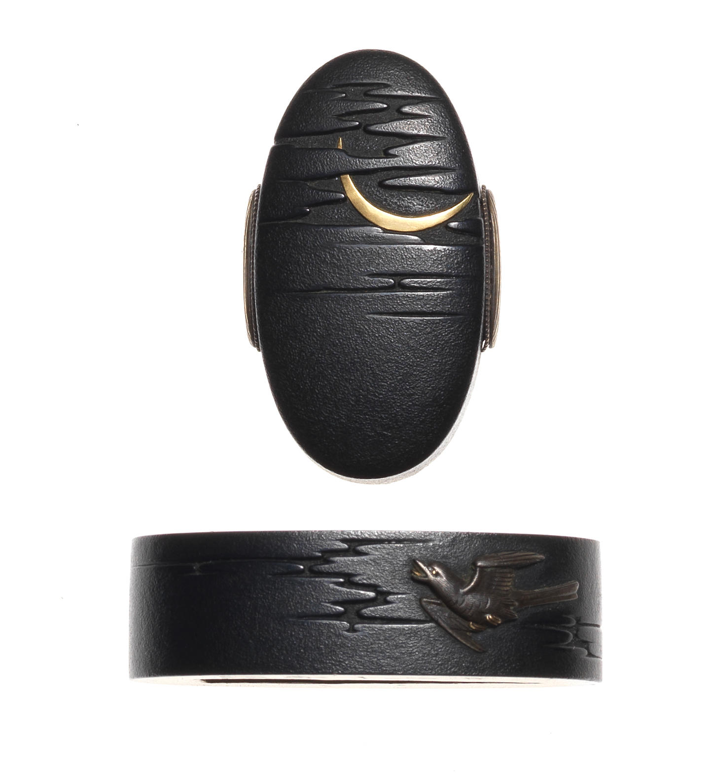 Bearing an ishime ground, inlaid with a nightingale flying past the crescent moon, in gold and shibuichi takazogan, signed Nakagawa Itteki; with wood storage box.