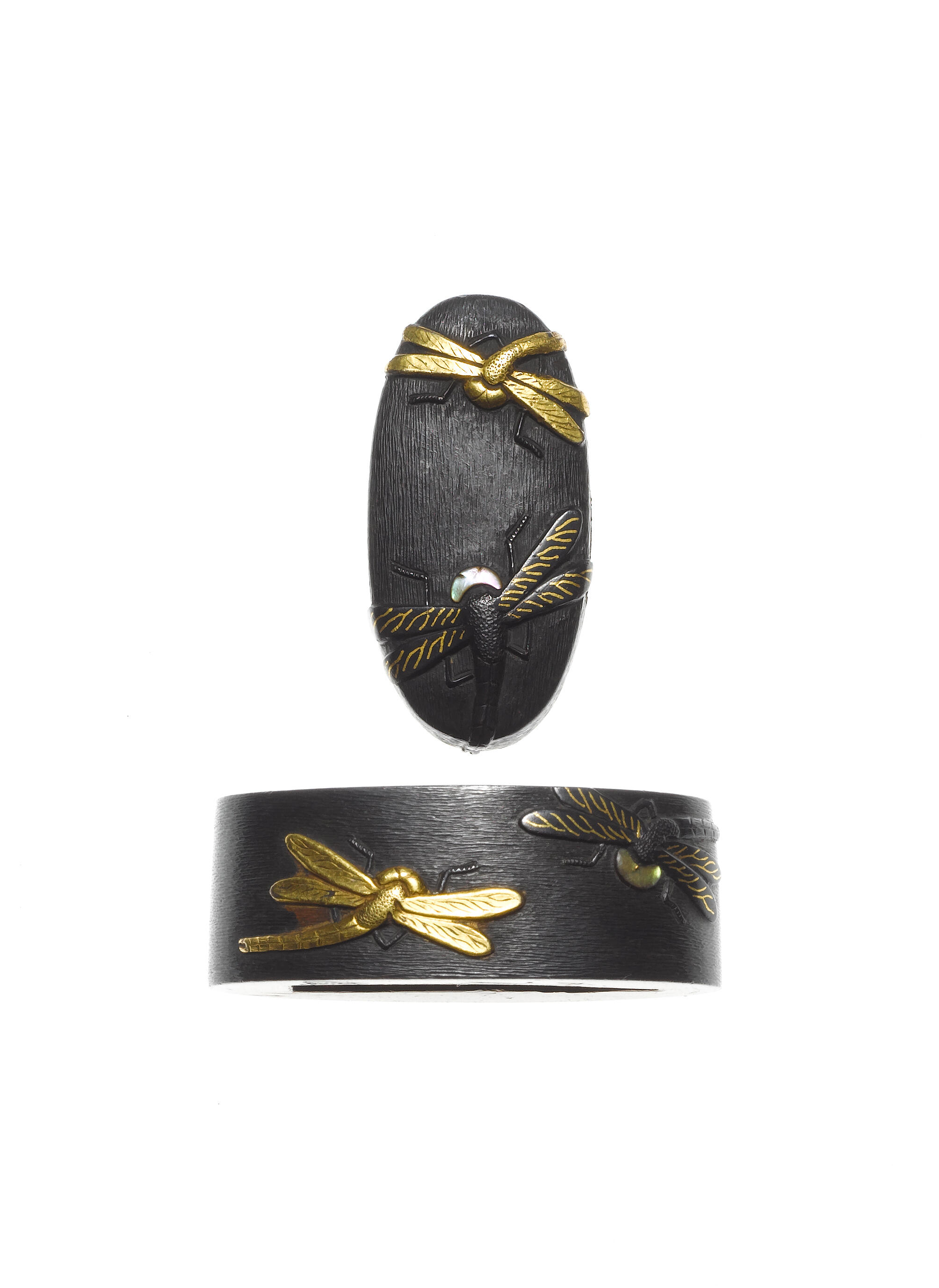 Bearing an ishime ground, inlaid in gold and shakudo takazogan with dragonflies, details in aogai, signed Jochiku with kao.