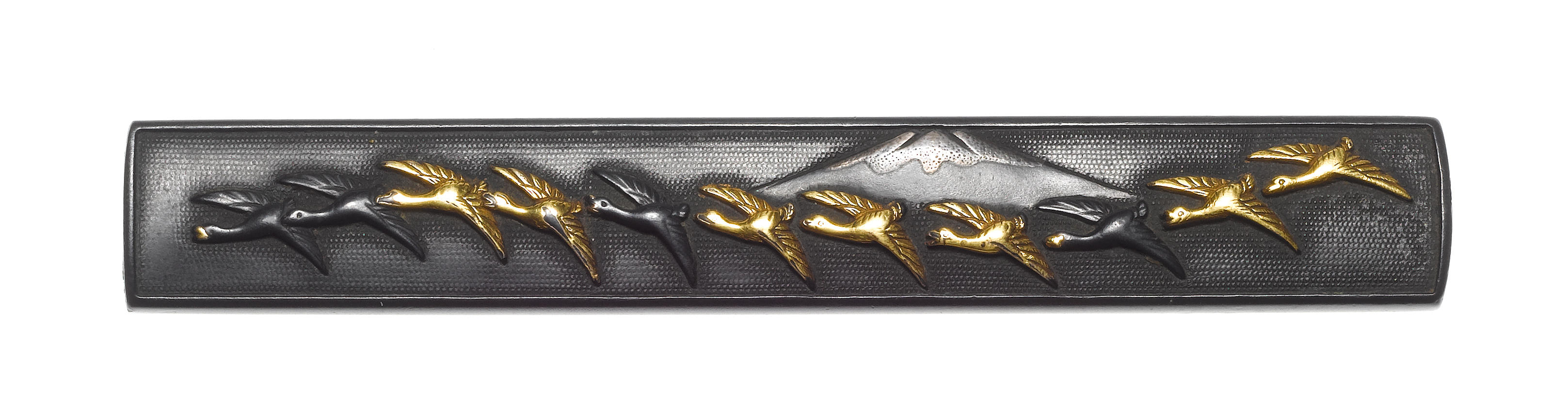 Bearing a nanako ground, carved in takabori and inlaid in gold and silver takazogan with a flock of eleven geese flying past Fujiyama, unsigned.