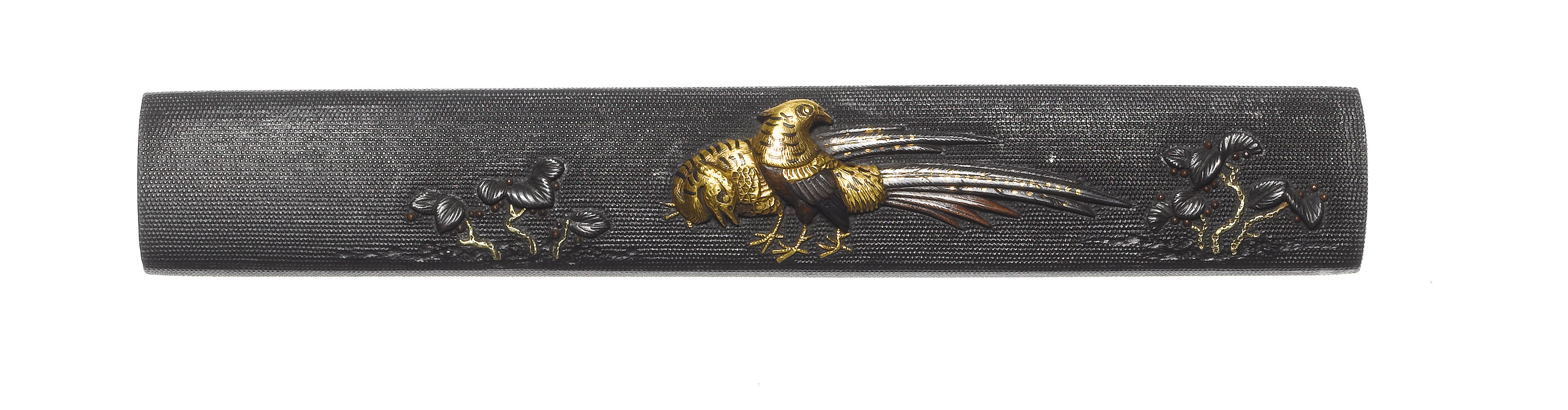 Bearing a nanako ground and inlaid with two pheasants among wild plants in iroe takazogan, the reverse engraved with an irregular linear design, signed Ishiguro Koretsune sen.