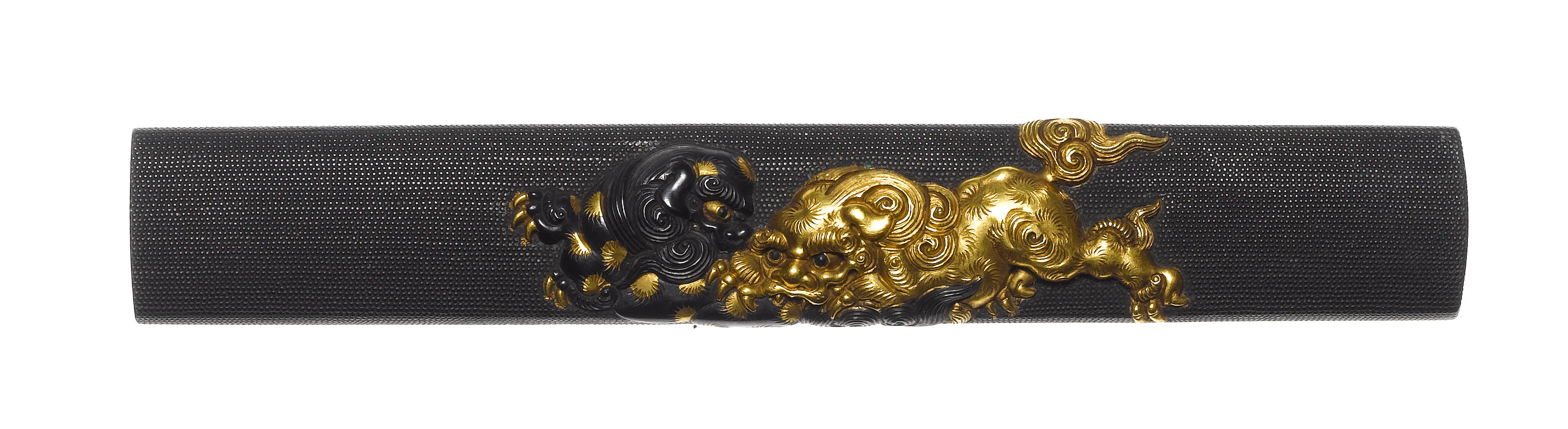 Finely inlaid in gold and shakudo takazogan with two fighting shishi, signed Soyo with kao.