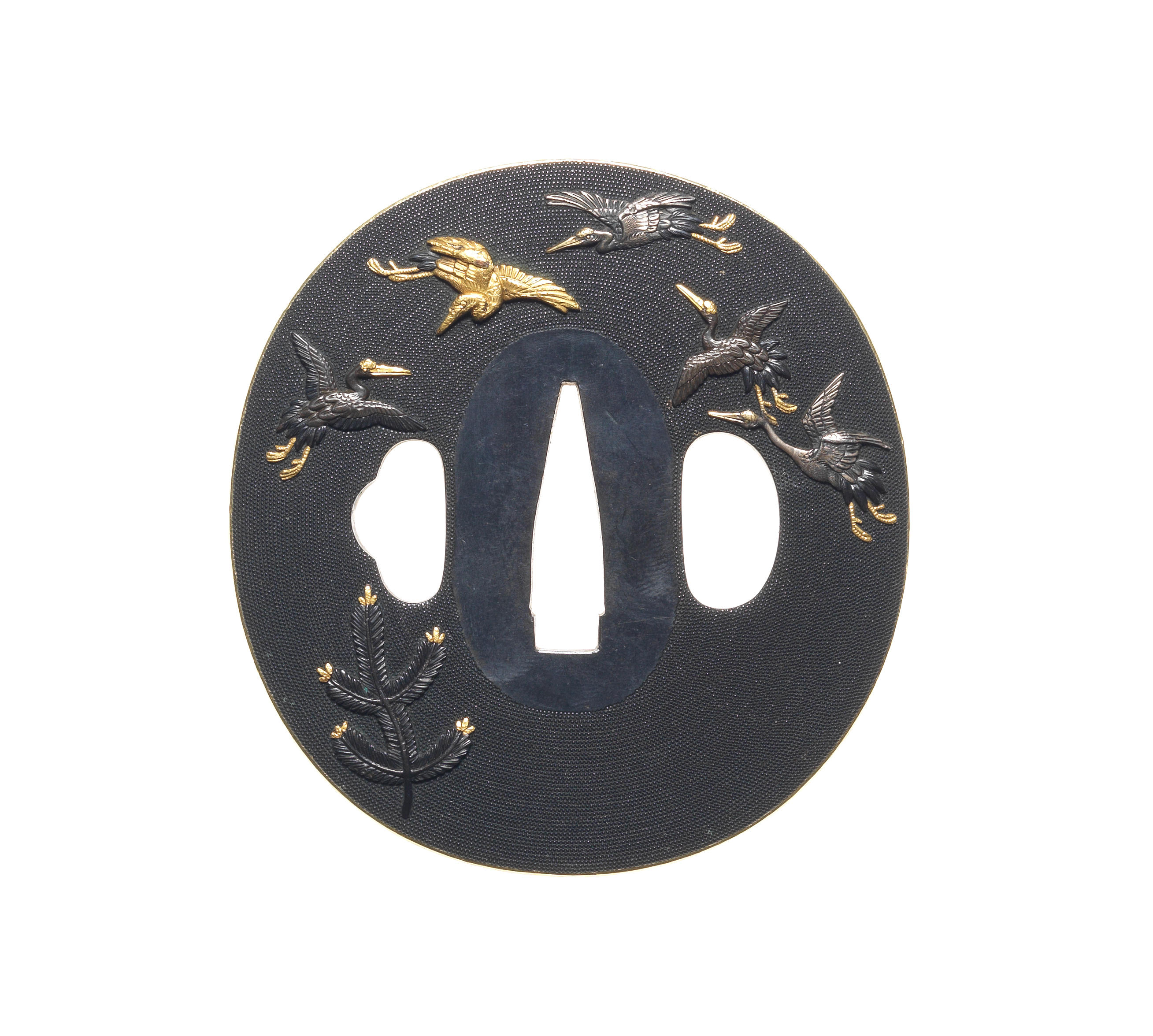 Of oval form, with gold mimi, inlaid on the fine shakudo ground with fourteen cranes wheeling in the sky among scattered branches of wakamatsu in gold, silver and shakudo takazogan, unsigned. 7.3cm (2 7/8in).