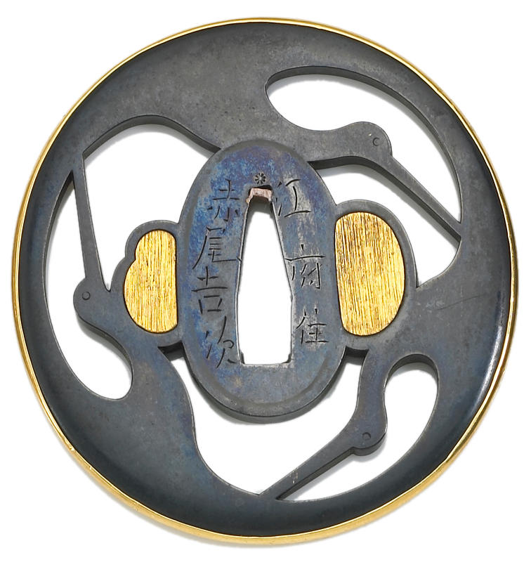 Of oval form, with gold mimi, pierced in positive silhouette with three flying cranes, signed Echizen ju Akao Yoshitsugu.