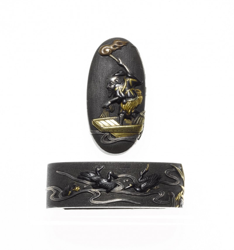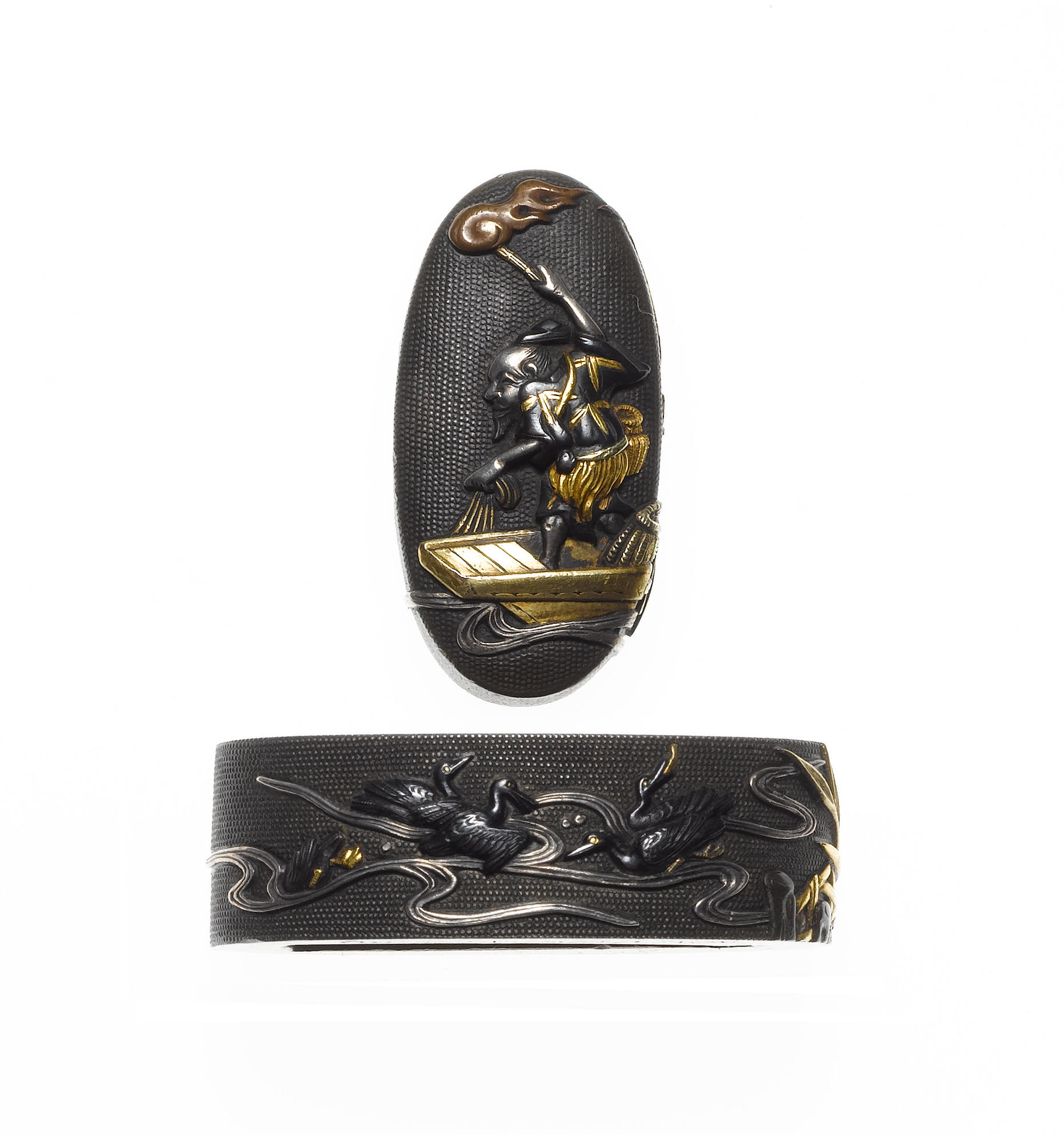 Bearing a nanako ground and inlaid in iroe takazogan with a cormorant fisherman working from a small boat at night and three cormorants in a river, signed Echizen Daijo Minamoto Nagatsune with kao.