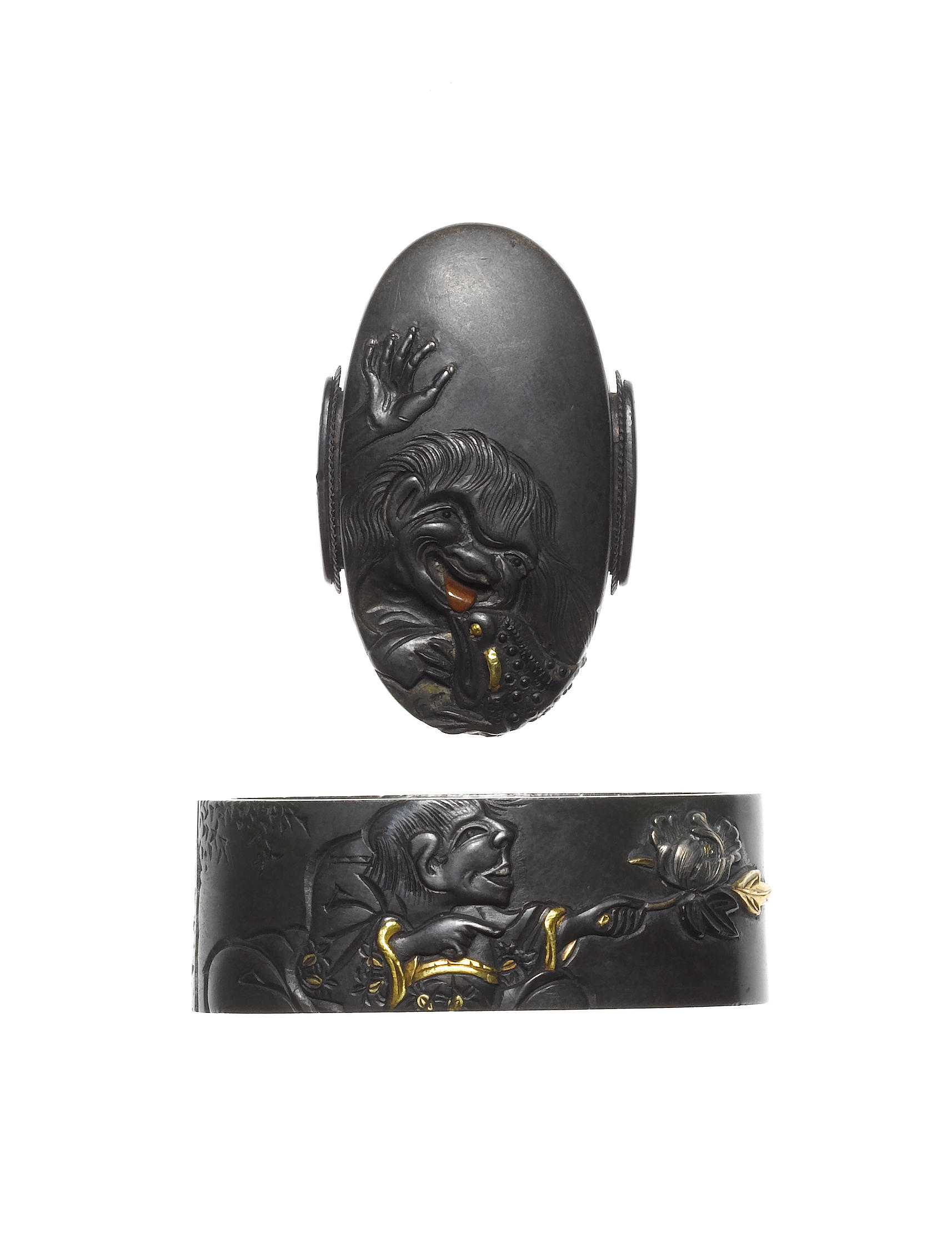 Carved in shishiaibori and inlaid in iroe takazogan with Gama sennin with a toad and Tekkai sennin holding a large peony, signed Tsunenao with kao.