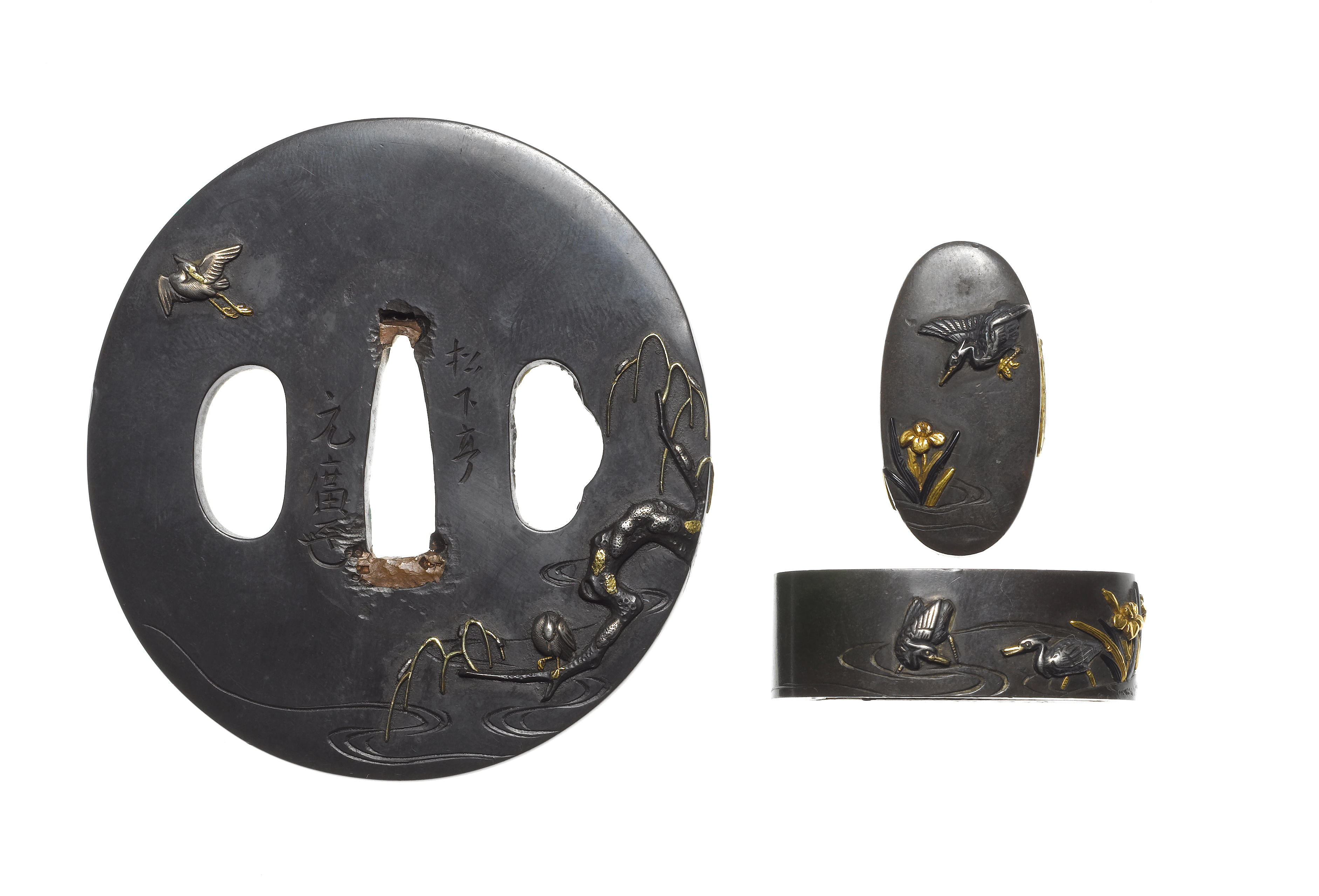 The tsuba of oval form, inlaid in iroe takazogan with herons flying, wading and perching on a willow branch in a stream, signed Shokatei Motohiro with kao; the fuchi-gashira inlaid with similar designs, signed Shokatei Motohiro