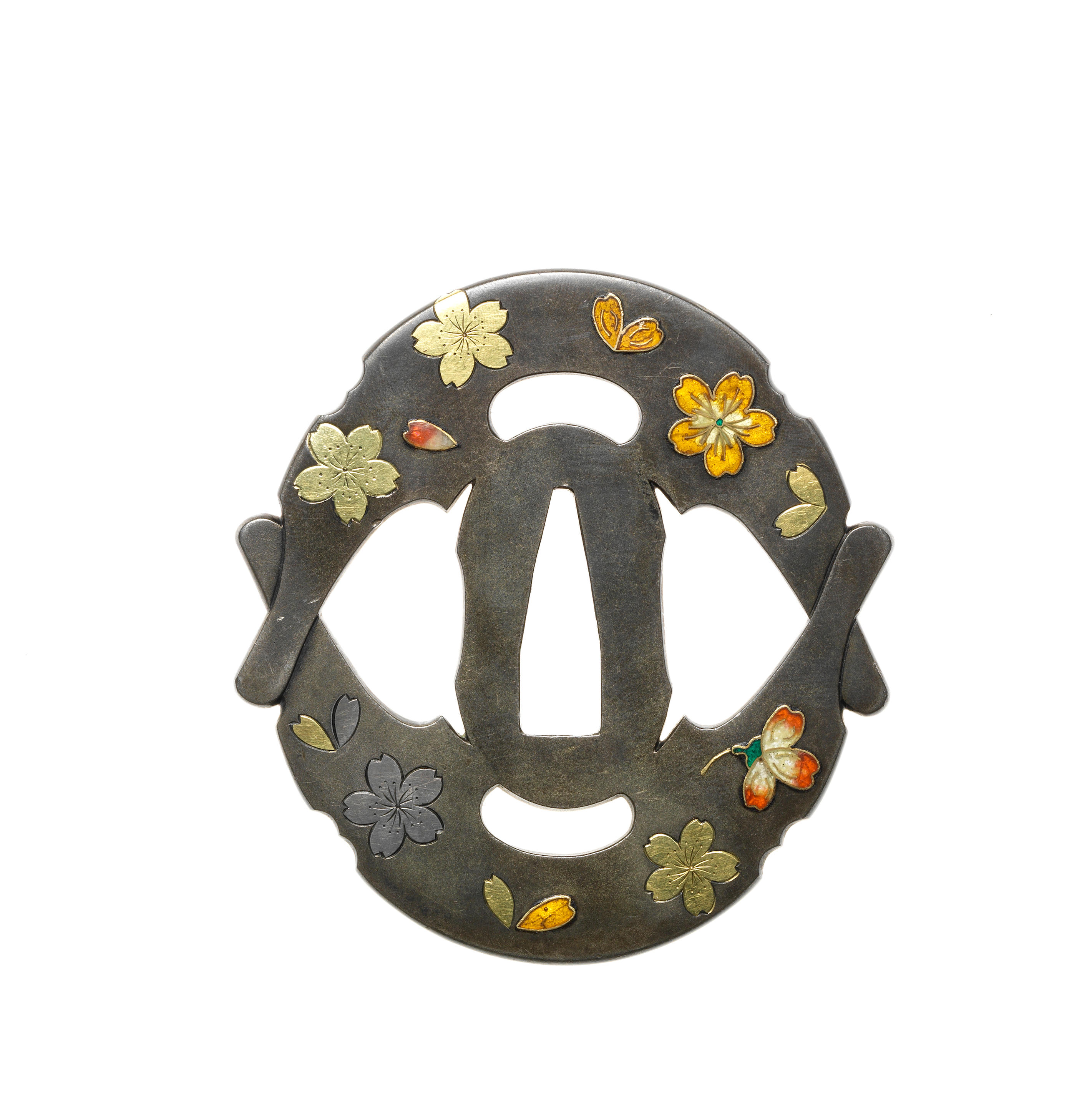 In the form of two kura (saddle) ends inlaid with falling cherry blossoms and individual petals in gold honzogan and cloisonné enamel, signed Hirata Harunari. 7cm (2¾in).