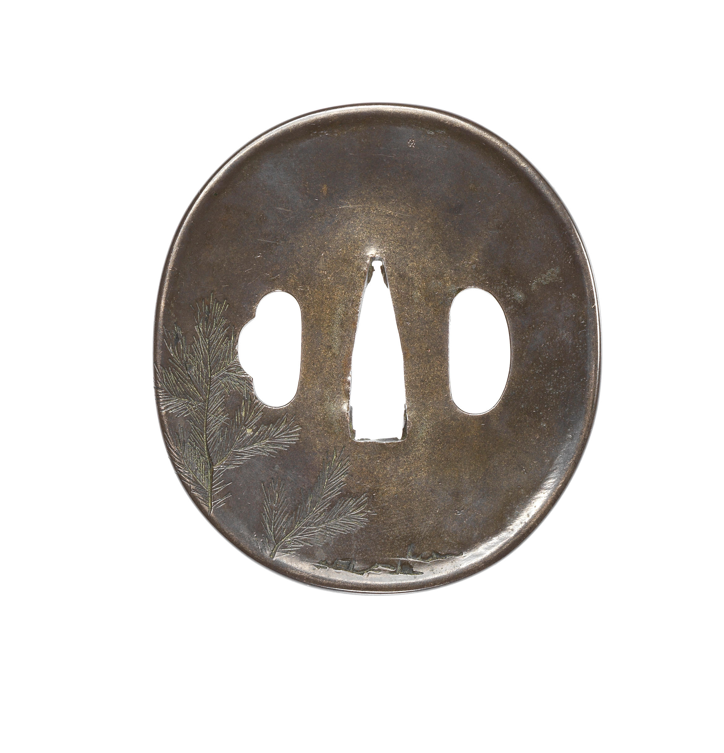 Of oval form with raised rim, engraved with manzai dancers performing to the amusement of a small boy, the reverse with wakamatsu, all in katakiri and kebori, signed Nagatsune with kao. 7cm (2¾in).