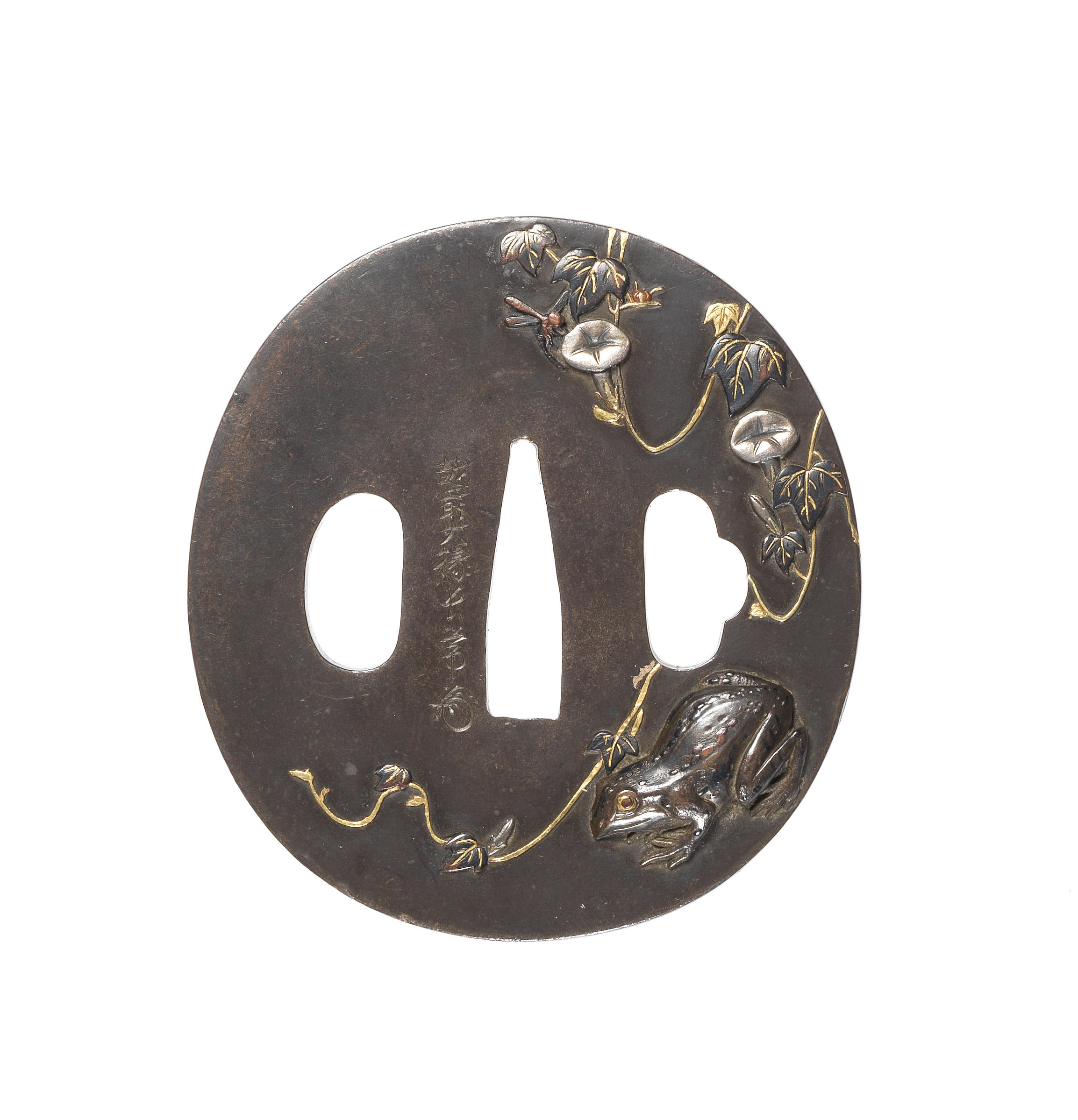 Of oval form, inlaid with a toad and trailing creeper, in gold, silver and dark shibuichi takazogan, the reverse with a continuation of the creeper in similar style, signed Echizen no Daijo Nagatsune with kao. 7cm (2¾in).