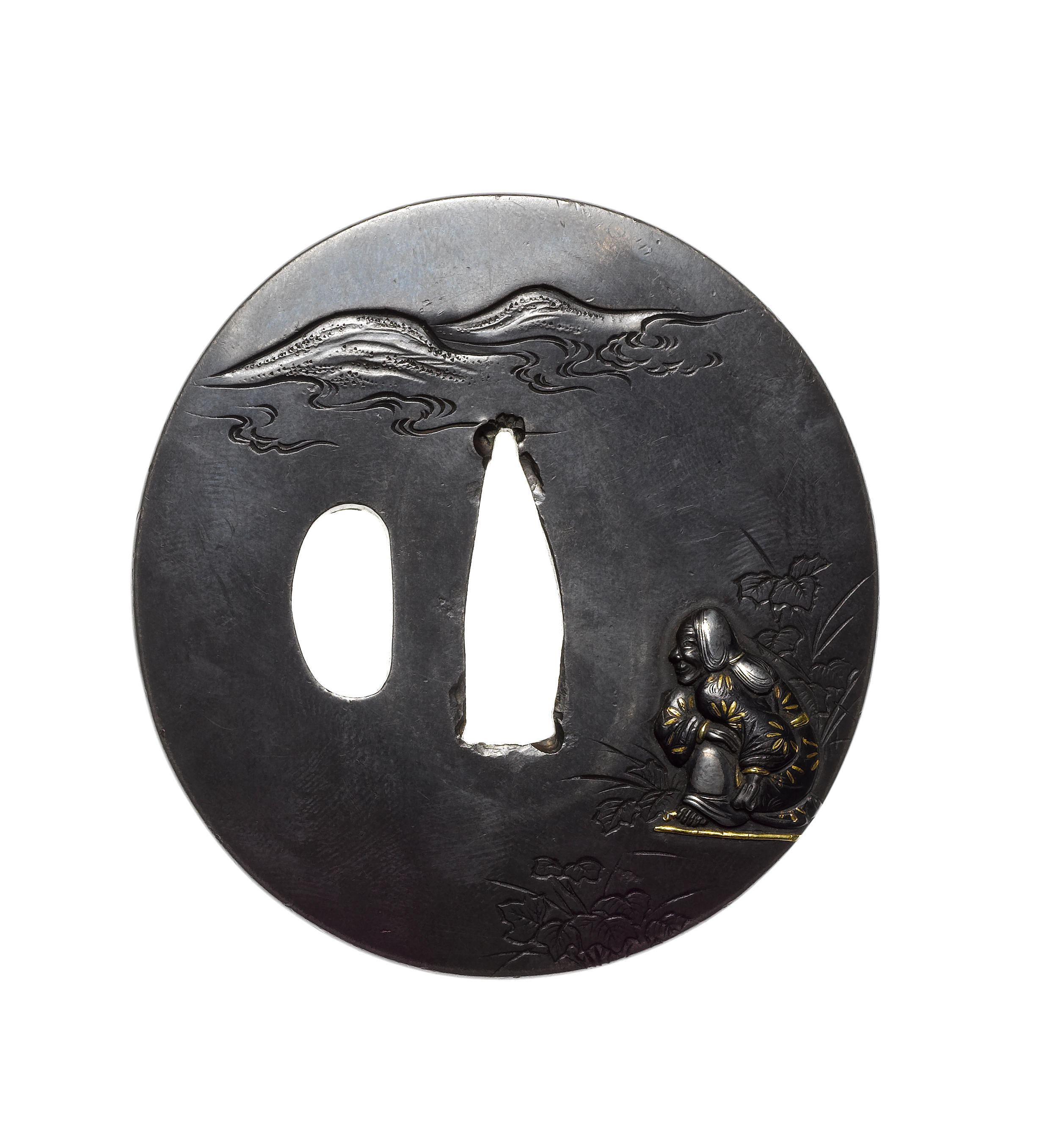 Inlaid in iroe takazogan with Ono no Komachi, the reverse with a thatched hut engraved in katakiri and kebori, signed Ichinomiya Kenryushi Nagayoshi with kao.