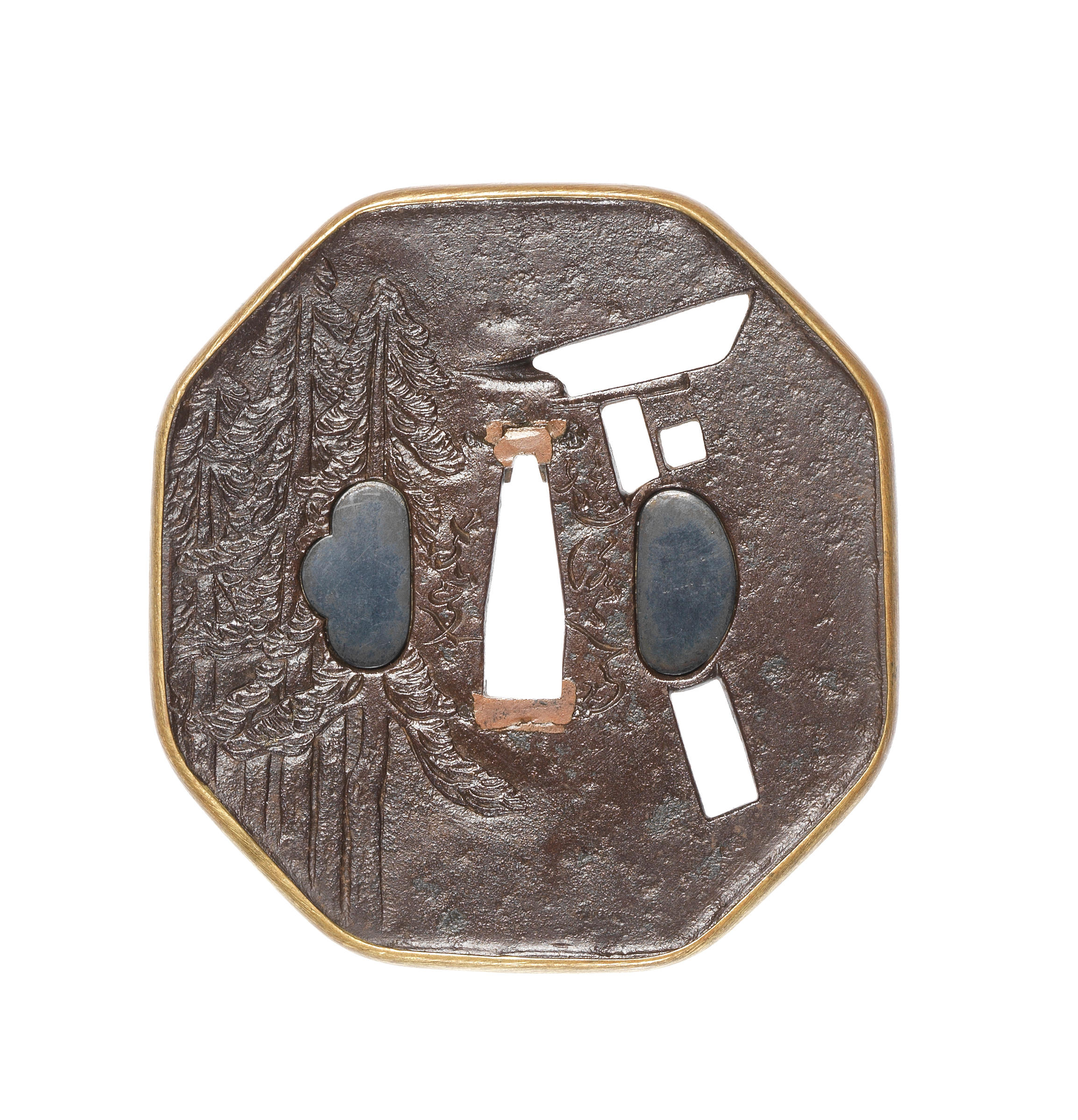 Of octagonal form, with a brass mimi, carved, pierced and inlaid with a spool of thread resting on the ground beside a torii by cryptomeria trees, in takabori with gold and silver details, signed Yurakusai Sekibun. 7.6cm (3in).