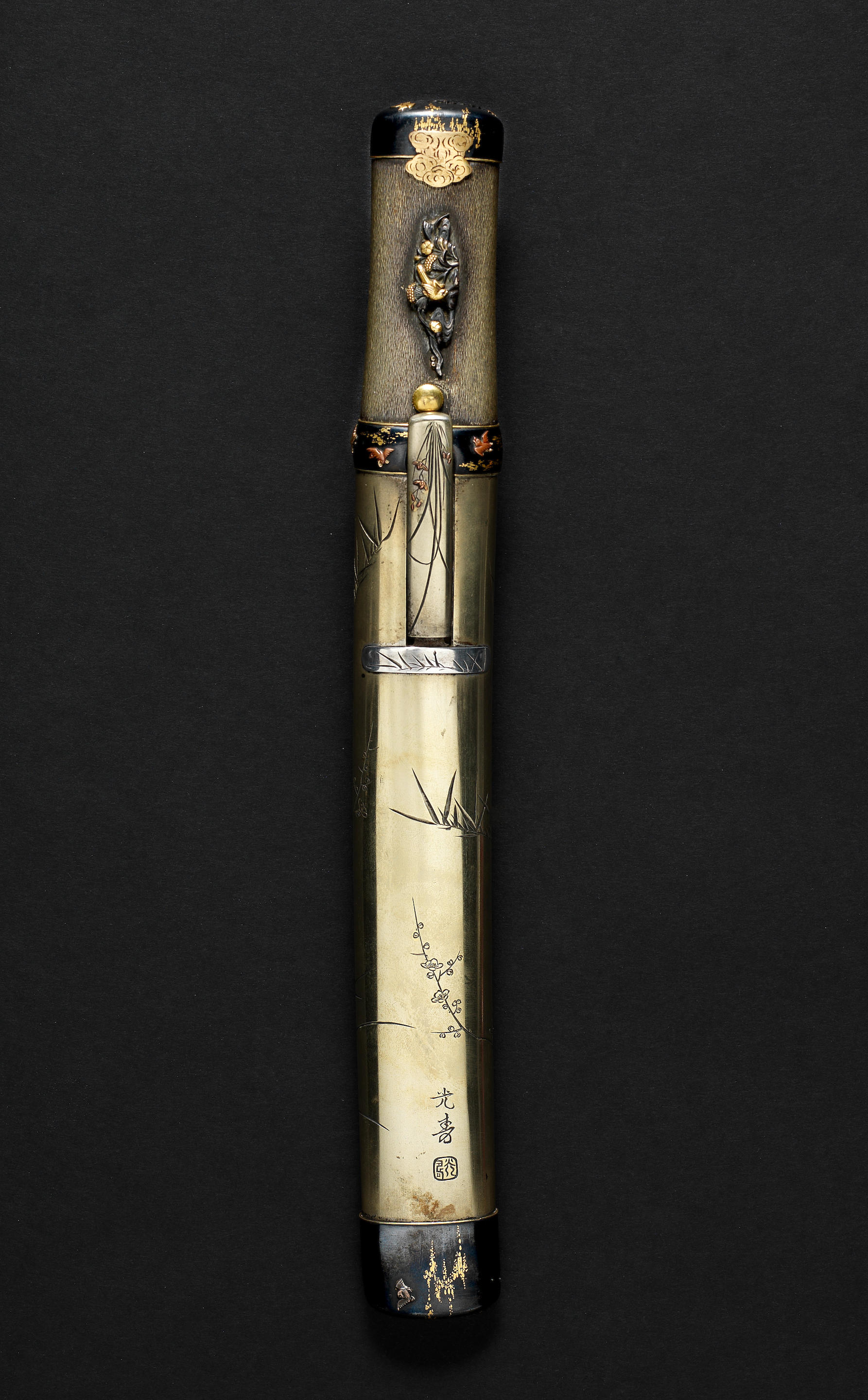 The saya decorated in kebori with bamboo and plants; each menuki designed as a bird perched beside a meandering stream.