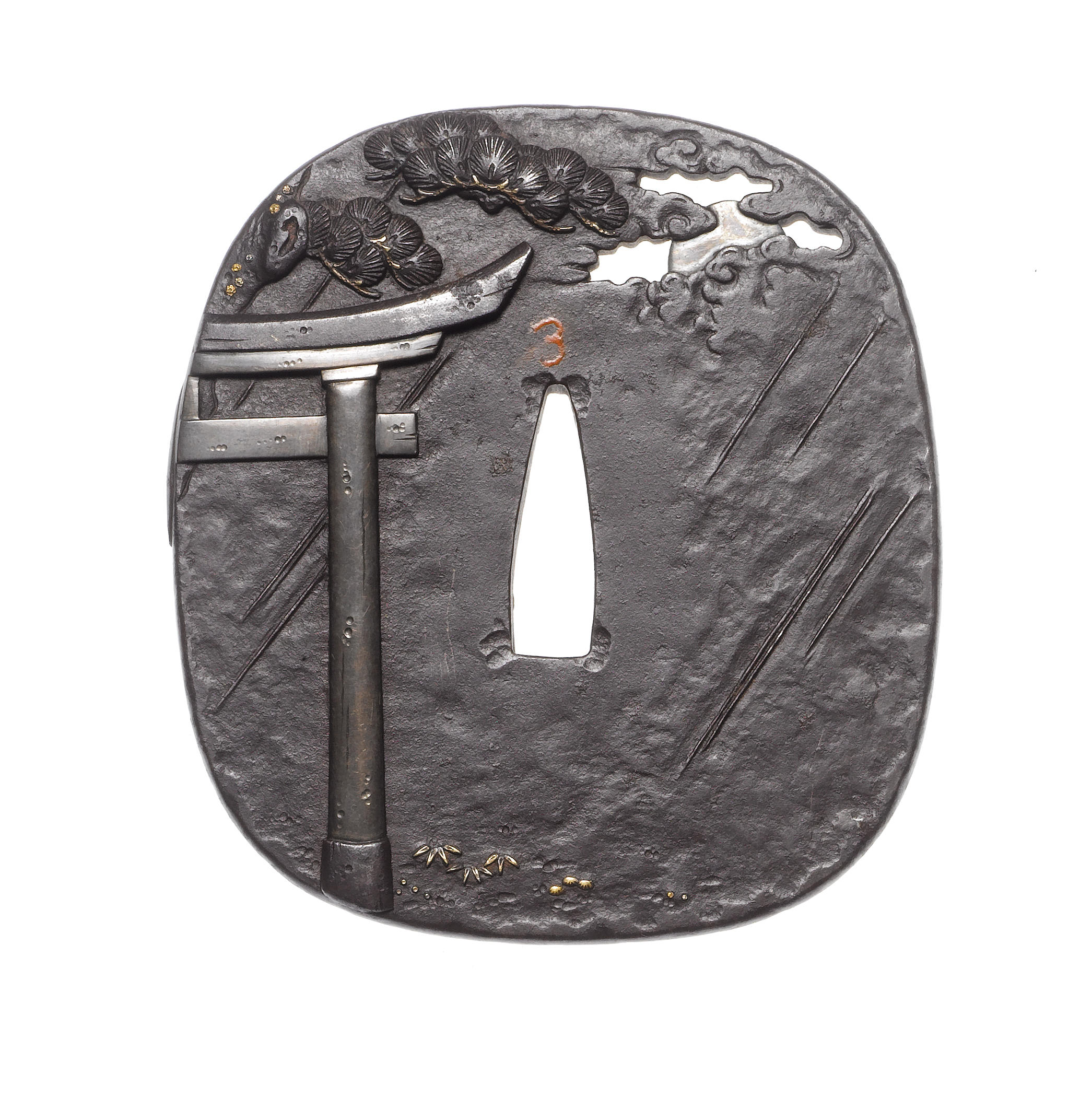 Of rounded rectangular form, carved in takabori, inlaid in shibuichi and gold takazogan and partly pierced with a nightwatchman in the rain, a bird flying past the moon above, and a pine tree above a torii on the reverse, signed Seiryoken Katsuhira with kao.