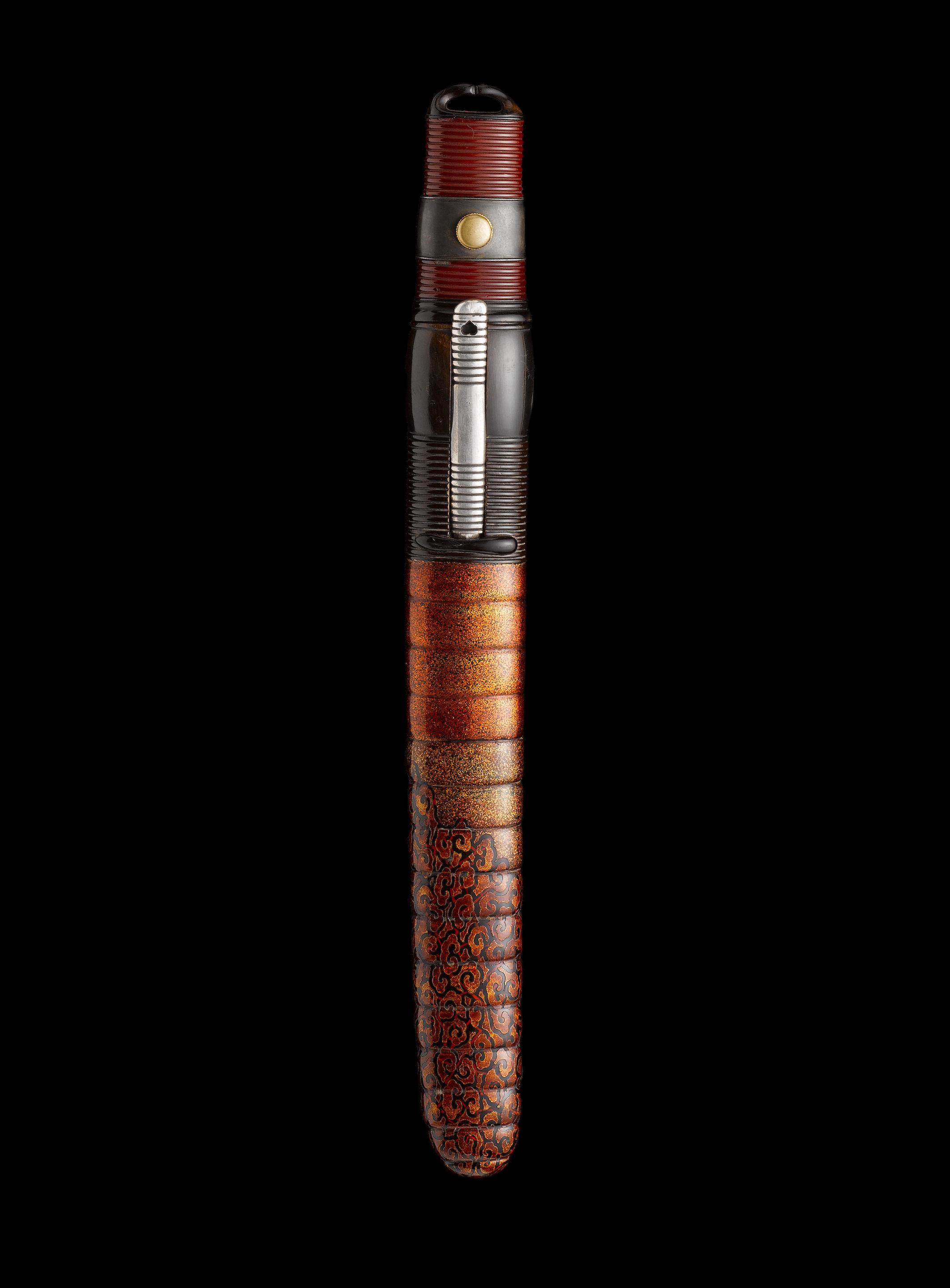 The blade of unokubi form, narrow sugu-ha of nioi, itame-hada with bonji horimono, the nakago with two mekugi-ana, unsigned; the ribbed saya of nashiji and wakasa-nuri; plain silver ribbed kozuka and kogai. The blade 16½cm (6½in) long.
