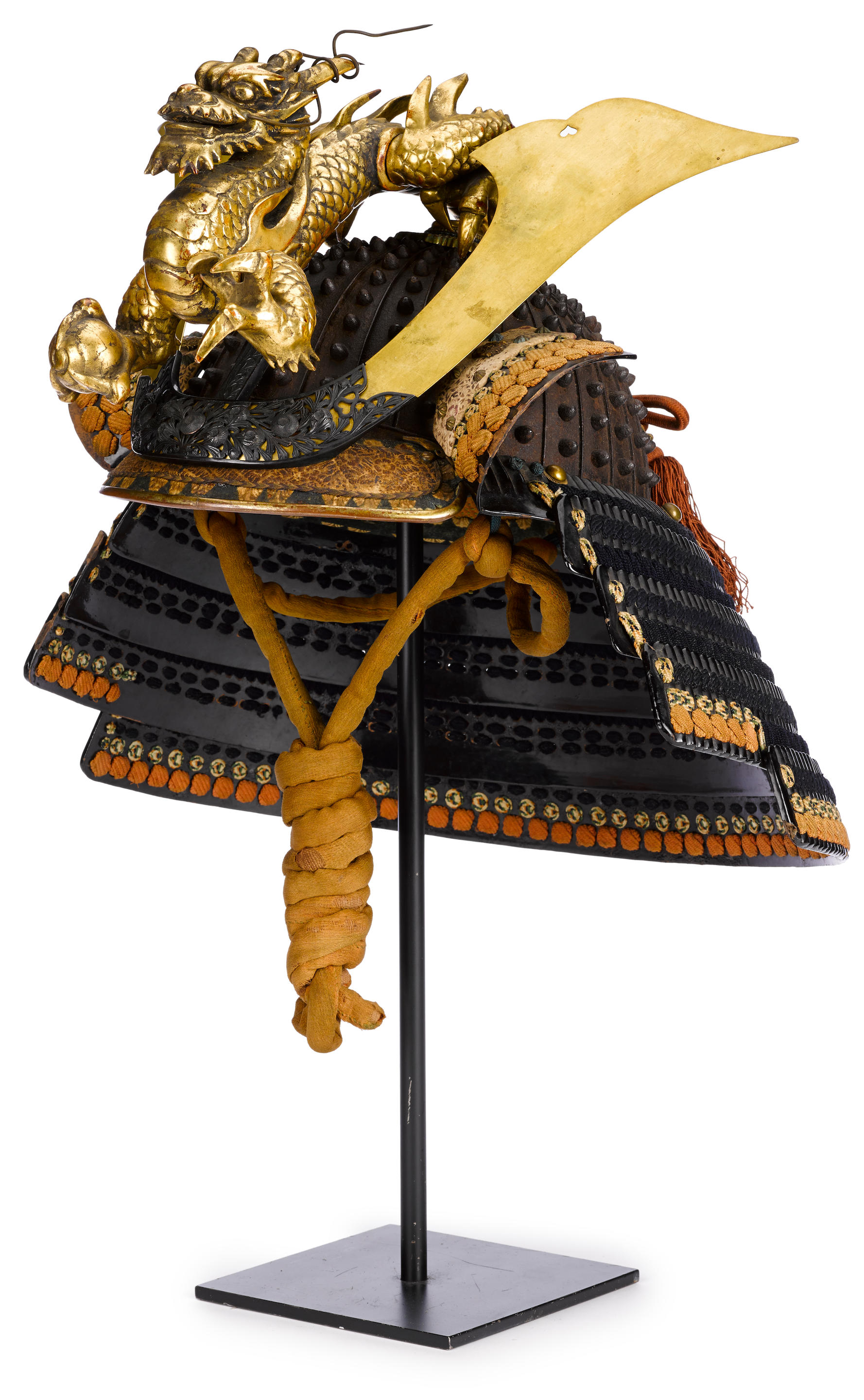 Comprising twenty-eight plate russet-iron oboshi kabuto, applied with a five-stage, gilt, copper and shakudo tehen kanamono, the mabizashi and fukigaeshi applied with stenciled doe skin, silk cords and gilt metal family crests, and a shakudo and gilt kuwagatadai pierce-carved with chrysanthemum flowers and leaves, gilt-copper kuwagata and a large gold lacquer dragon maedate, the bowl mounted with a five-lame kiritsuke iyozane shikoro lacquered black and laced in navy with colored highlights; with an iron Okina menpo forged with deep wrinkles and a separate nose plate, applied with a boar bristle mustache and chin tuft and inscribed in red lacquer on the chin Muneyoshi saku, fitted with a three-lame solid plate yodarekake lacquered black