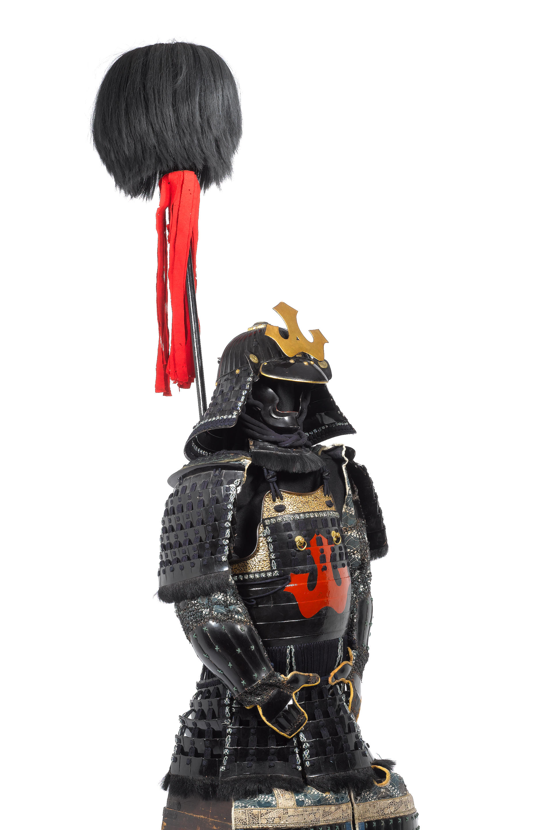 A thirty-two-plate suji bachi kabuto with itamono komanju jikoro, to the front a gilded wood maedate in the form of a stylised yama kanji. The do of okegawa yokohagi style with the muneita and waki ita in gilded roughened lacquer and with a copy of the maedate painted on the front in red. On the back of the do a sashimono of a large tuft of black hair above red rasha tassels. A simple hanbo mask, chu sode, shino gote, karuta gane haidate and tsutsu suneate. Lacquered black overall and laced in dark blue sugake odoshi. The yodarekake and kusazuri edged with fur. Together with an armour box.