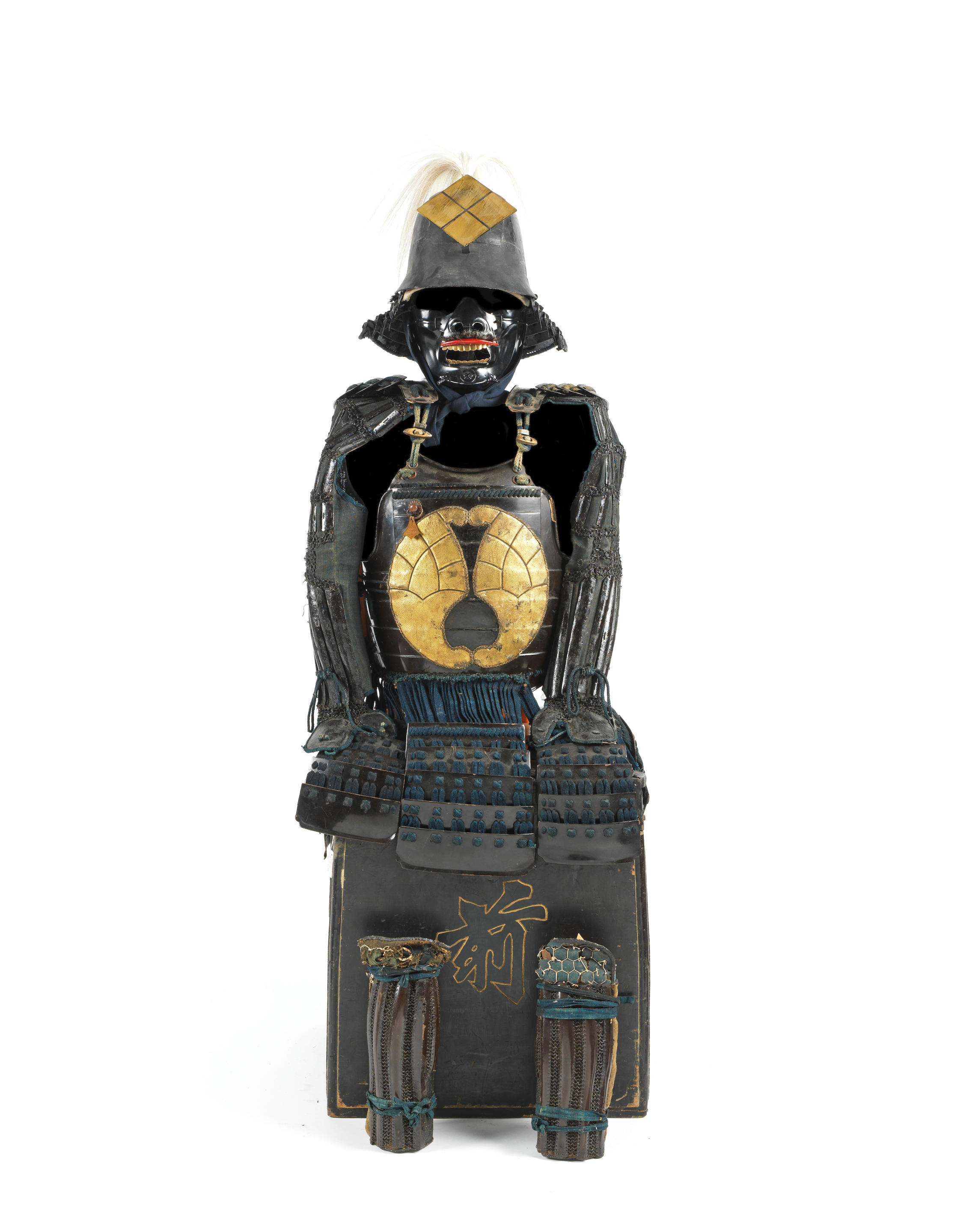 The three-plate zunari-kabuto black lacquered with a five lame Hineno jikoro, modern hair tuft in the top of the bowl and a gilt wood maedate on the front, a modern mask without a yodarekake, shinogote, black lacquer nimai yokohagido with a mon applied to the front in gilt leather, shino suneate; with an armour box and a wood stand.