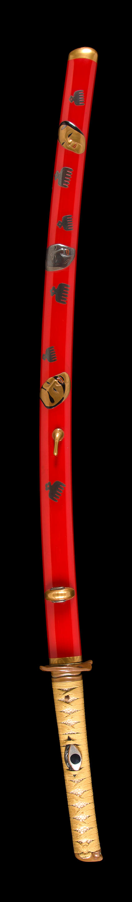 The red-lacquer saya designed with noh masks and combs in iroe takamakie and hiramakie, the kuri-gata, kaeshi-zuno and kojiri all decorated with Imagawa family crests in gold lacquer, the tsuka mounted with copper fuchi-gashira designed as a nose and mouth and with a pair of menuki designed as eyes rendered in copper, silver, shakudo and enamel, the copper tsuba cast and carved to resemble ears