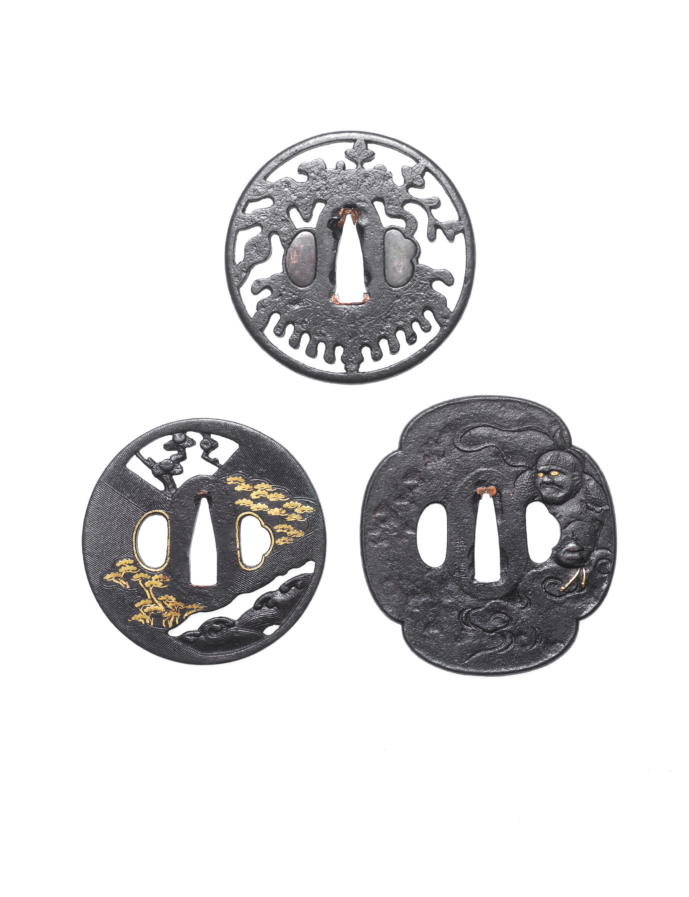 Comprising: Owari sukashi informal kiri within a half-pipe rim; Daigoro sukashi pierced with a ho-o bird; ko-Hamano school mokko tsuba carved with Yorimasa, signed Nagayuki; Mito tsuba with a landscape; and an Aiwa-Shoami tsuba pierced and inlaid with pine trees and waves.