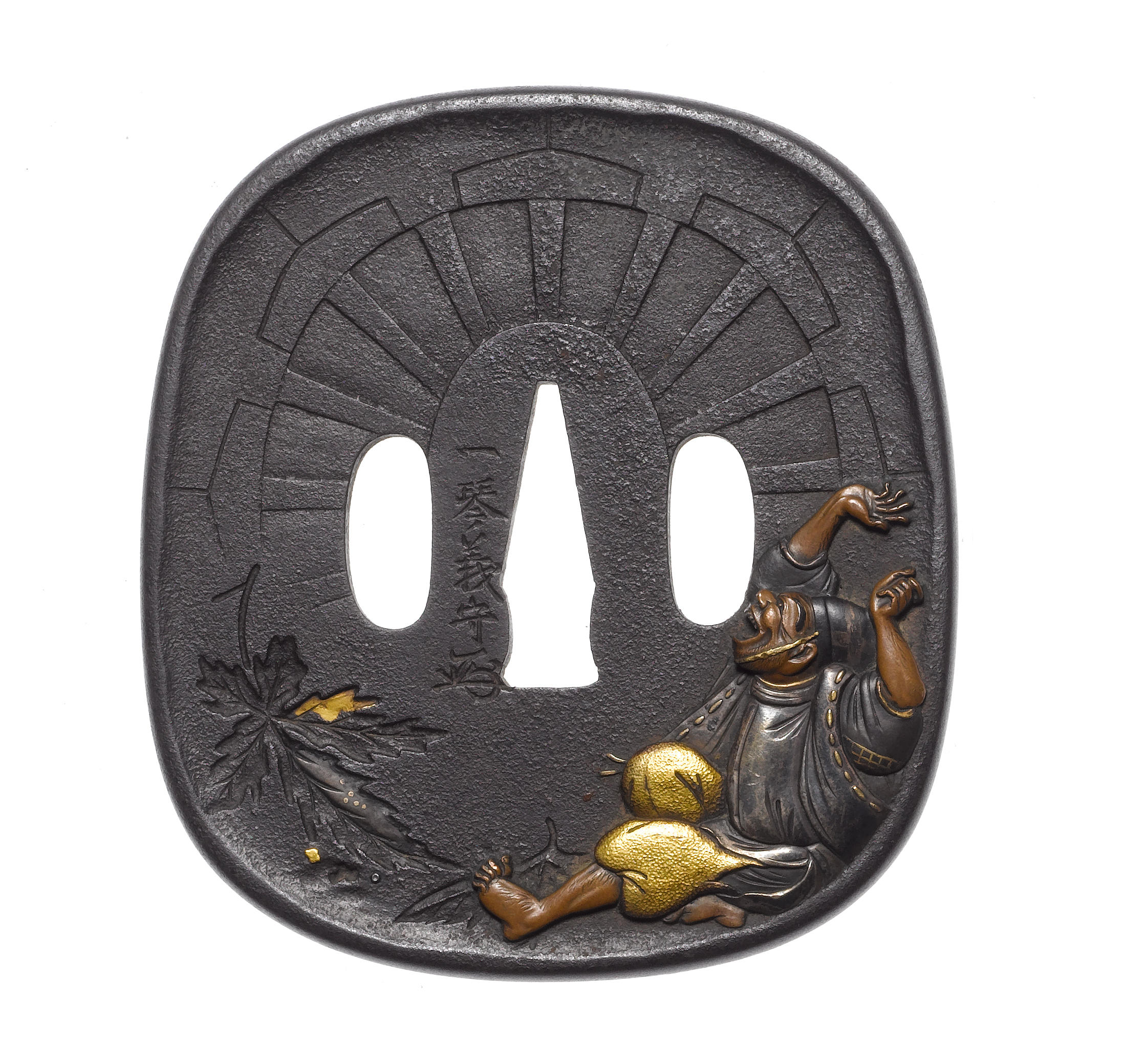 Of rounded rectangular form with raised rim, carved and inlaid with an eji falling back beside a Buddhist wheel, over which leaves are falling, three leaves in sunk relief on the reverse, signed Ikkin Yoshimori with kao.