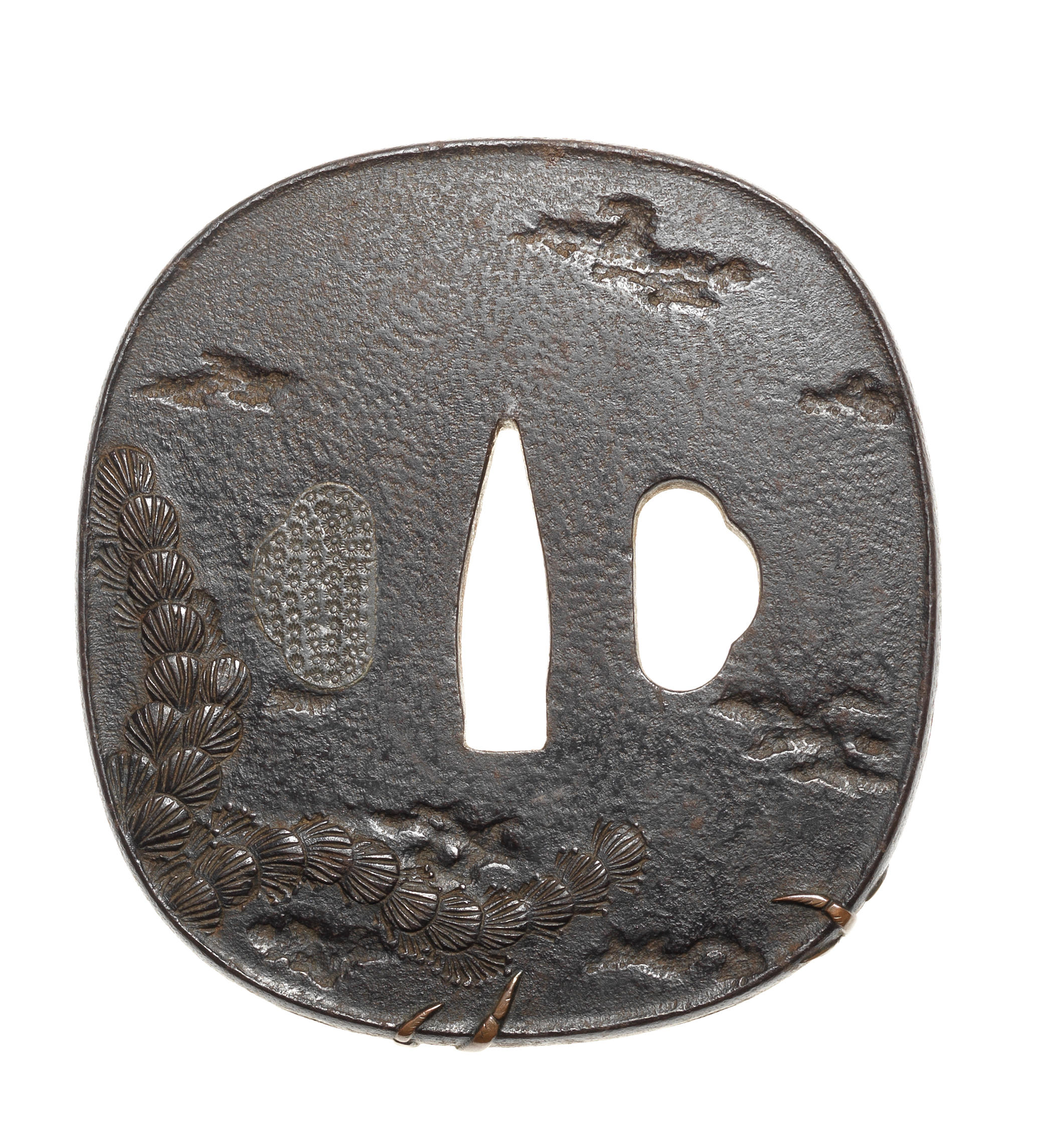 Iron, of large size, inlaid on the hammered ground with a large crab in copper takazogan, its eyes and pincers of shakudo, signed with a kao,8.3cm (3¼in).