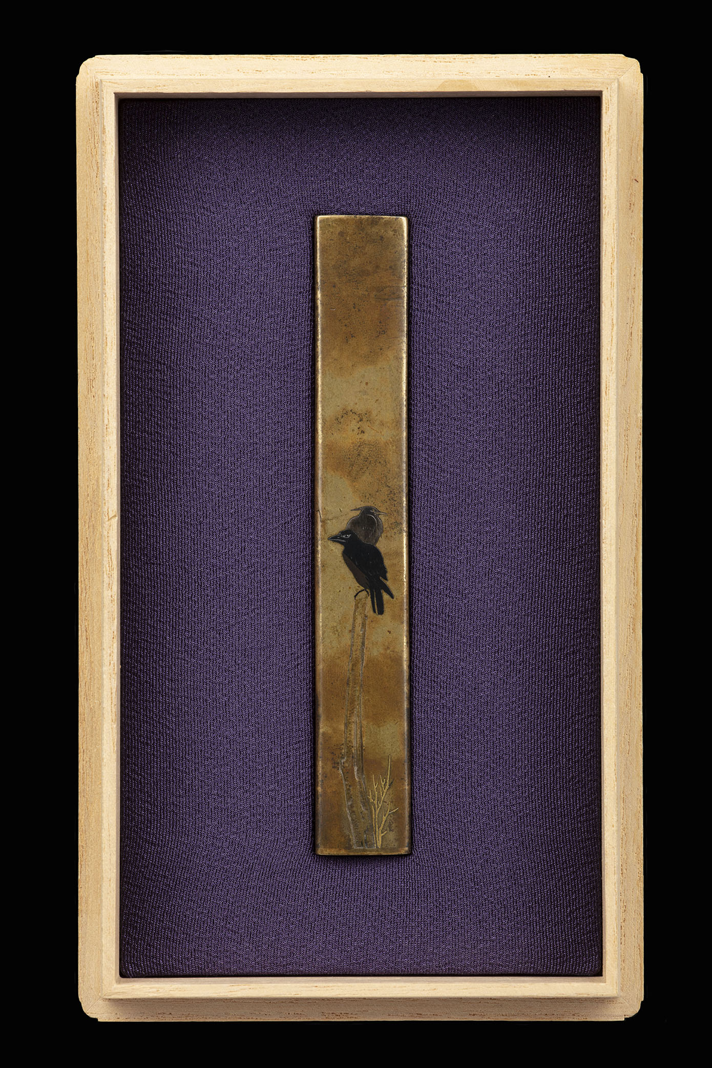 The right most portion says that the engraving was done by means of a picture by Hanabusa Itcho (1652-1724), who was a student at the Kano school of Painting in Kyoto and studied poetry under the famous Matsuo Basho. While I could not find an exact example of a painting by Hanabusa with a crow and a heron, there is an example of a painting with remarkably similar composition in the Kyoto National Museum. That painting shows what is described as a “magpie” perched on a plum branch and is compositionally very similar to the bird behind the crow on this kozuka which is specifically described in the NBTHK paper as a heron. The Japanese name for magpie and heron are similar; “kasasagi” and “sagi”. However, Kasasagi is also the name of a Samurai family from the Nara region, not far from Kyoto. So, it’s quite possible that the illustration on this kozuka employs some of the wordplay that Mitsuoki seems to have enjoyed so much in his works, and this piece was a custom order or gift for a member of the Kasasagi family. Symbolism and wordplay expressed thematically are ubiquitous in Japanese sword fittings, and the implications and meanings often expand into multiple meanings depending on the contexts. I am confident that there are such meanings in this piece yet to be defined, and research is still ongoing so this page will be updated as new information is found.