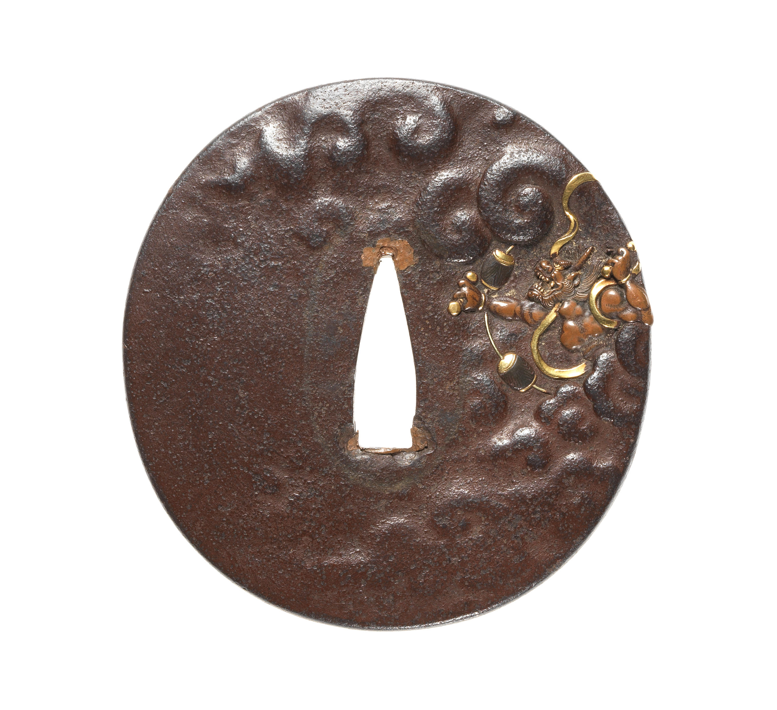 Of circular form, carved and inlaid on the hammered ground with Raiden holding two thunderbolts and with drums as he produces a violent storm, in copper takazogan with gold and shakudo details, with indecipherable signature. 7.6cm (3in).