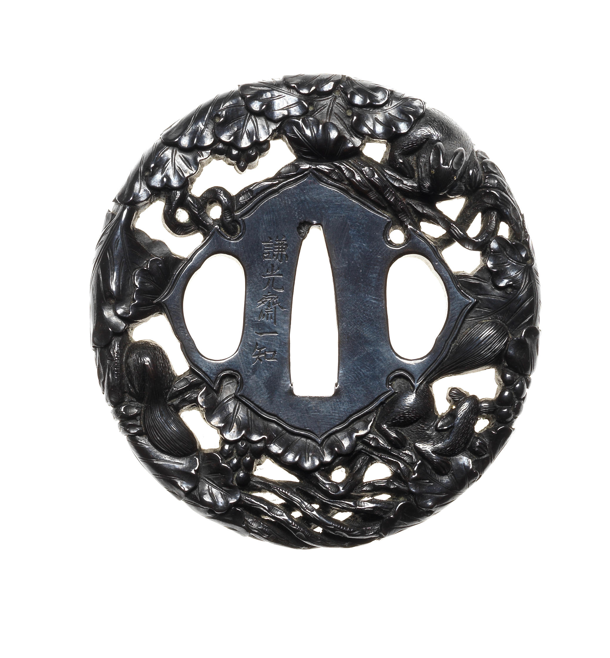Shakudo, the thick plate carved and pierced with an elaborate design of squirrels among grape vines, signed Kenkosai Kazutomo (Kazuaki), 7.3cm (2 7/8in).