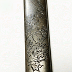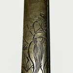 Finely engraved with Katakiri work , Shoki is looking up into a tree where a rather annoyed oni is trying to hide.