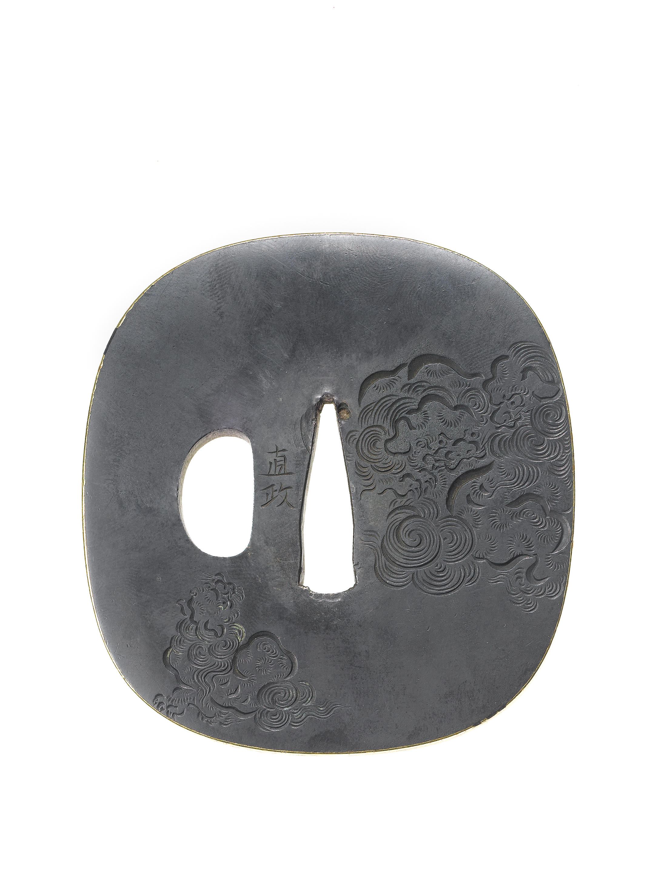 Of rounded rectangular form with gilt mimi, engraved in katakiri and kebori with three shishi, the reverse with peonies by a stream, signed Naomasa. 7.6cm (3in).