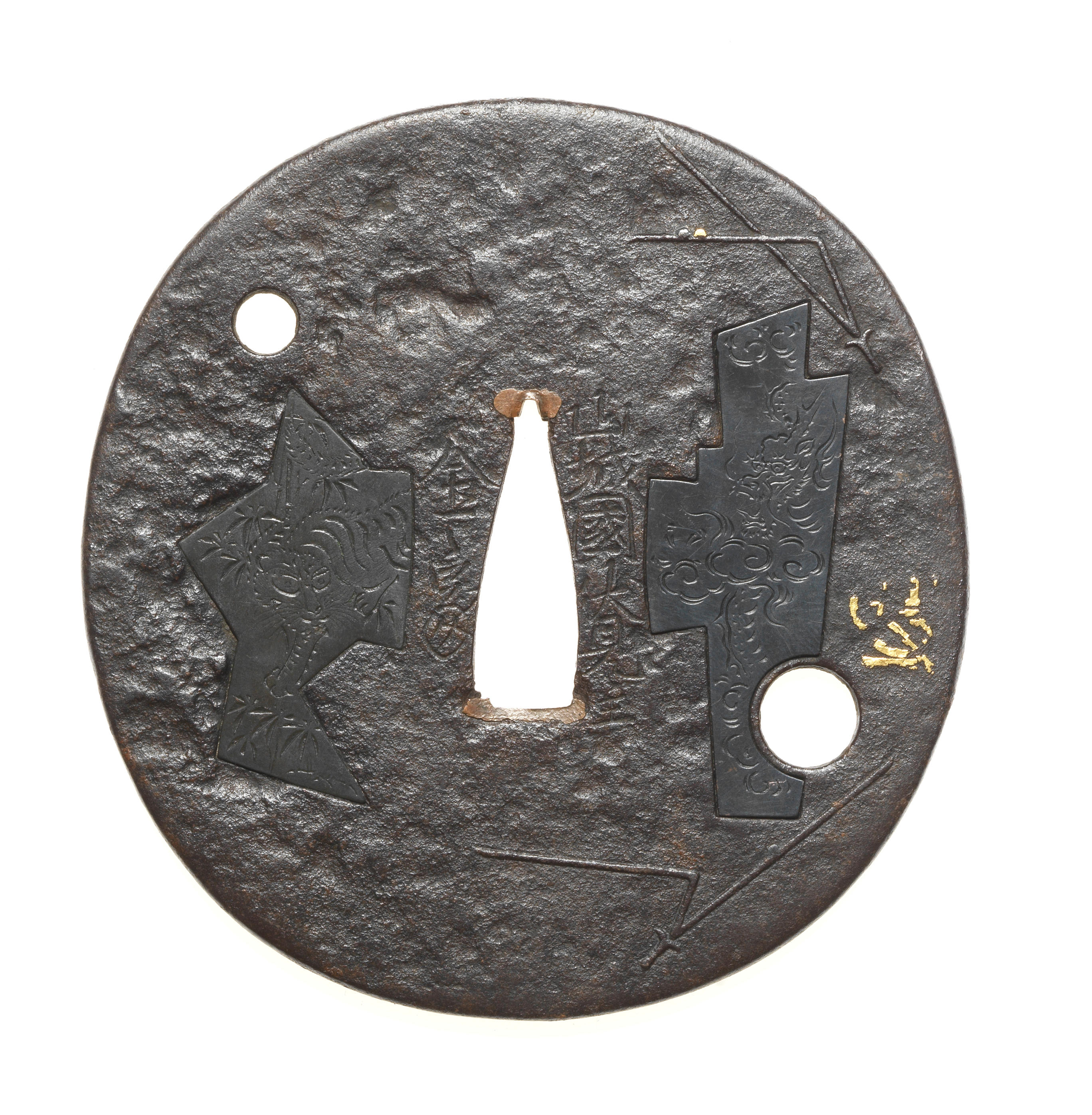 the second of circular form, inlaid with asymmetric shakudo panels of tiger and dragon, signed Yamashiro no kuni Fushimi no ju Kaneie, 8.5cm (3 3/8in);