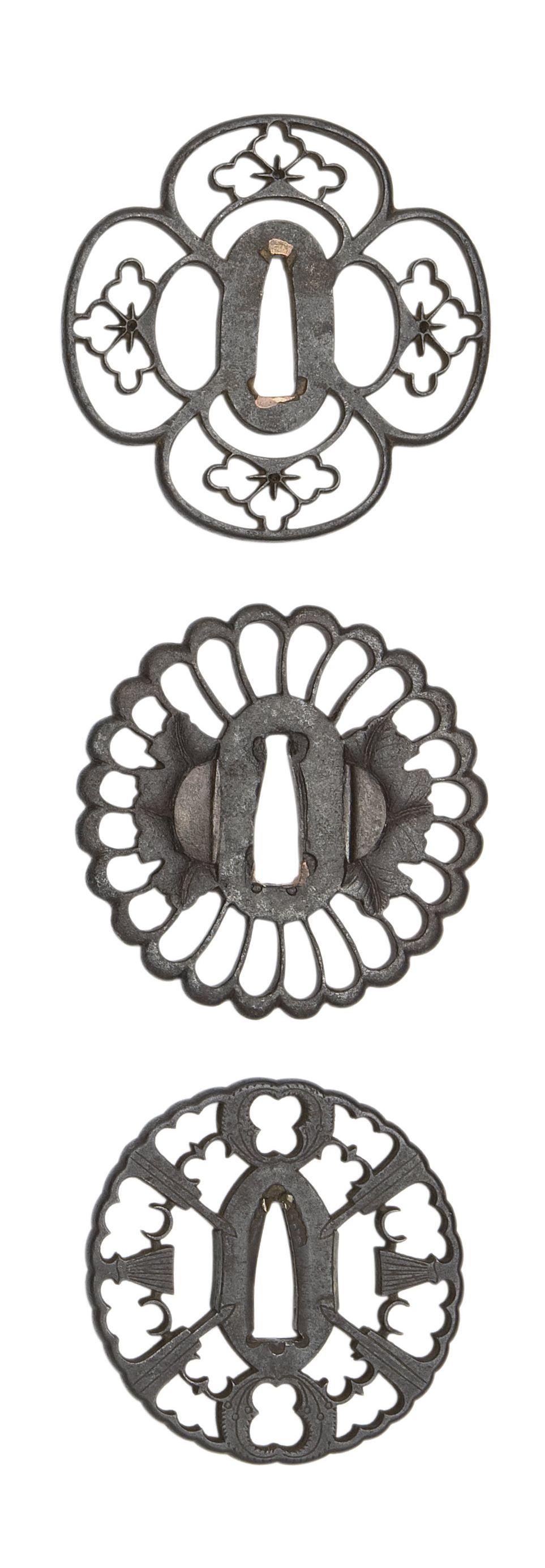 The first of mokko-shape with flower mon; the second pierced as a Kiku and engraved around the hitsu-ana with leaves; the last circular and pierced with folded fans, birds, ginger flowers and tea whisks, each in a wooden box (3)
