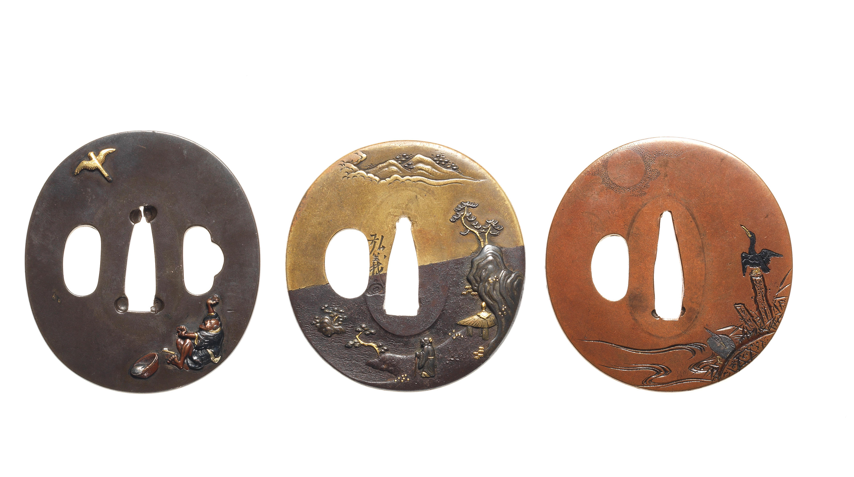 The first of diagonally divided iron and sentoku, carved and inlaid with a sage beneath an overhanging rock by a lake, signed Hiroyoshi with kao, 6.4cm (2½in); the second of shibuichi, inlaid in iroe takazogan with a peasant falling back as a goose dives down towards him, signed Echizen no Daijo Nagatsune […] Sadanaka kore o horu with kao, 6.7cm (2 5/8in); the third of copper, engraved and inlaid with a cormorant and an egret by a stream, signed Heianjo no junin Ichinomiya Kenryushi Nagayoshi with kao, 6.4cm (2½in). (3).