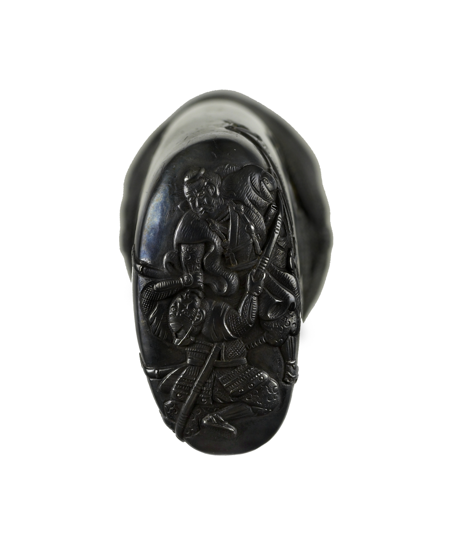 English: The tsuka is covered in ray skin (“same”) and wrapped in silk cord. The gold menuki beneath the cord are in a design of poetry papers with cherry blossoms. The kashira on the end of the hilt shows a yamabushi (mountain warrior monk) attacking a warrior. Other fittings in this ensemble show warriors who supported Emperor Go-Daigo (1288-1339) during the Nanboku war. Yamabushi assisted Go-Daigo’s forces in battles for control of Kamakura. This is part of a mounted set.