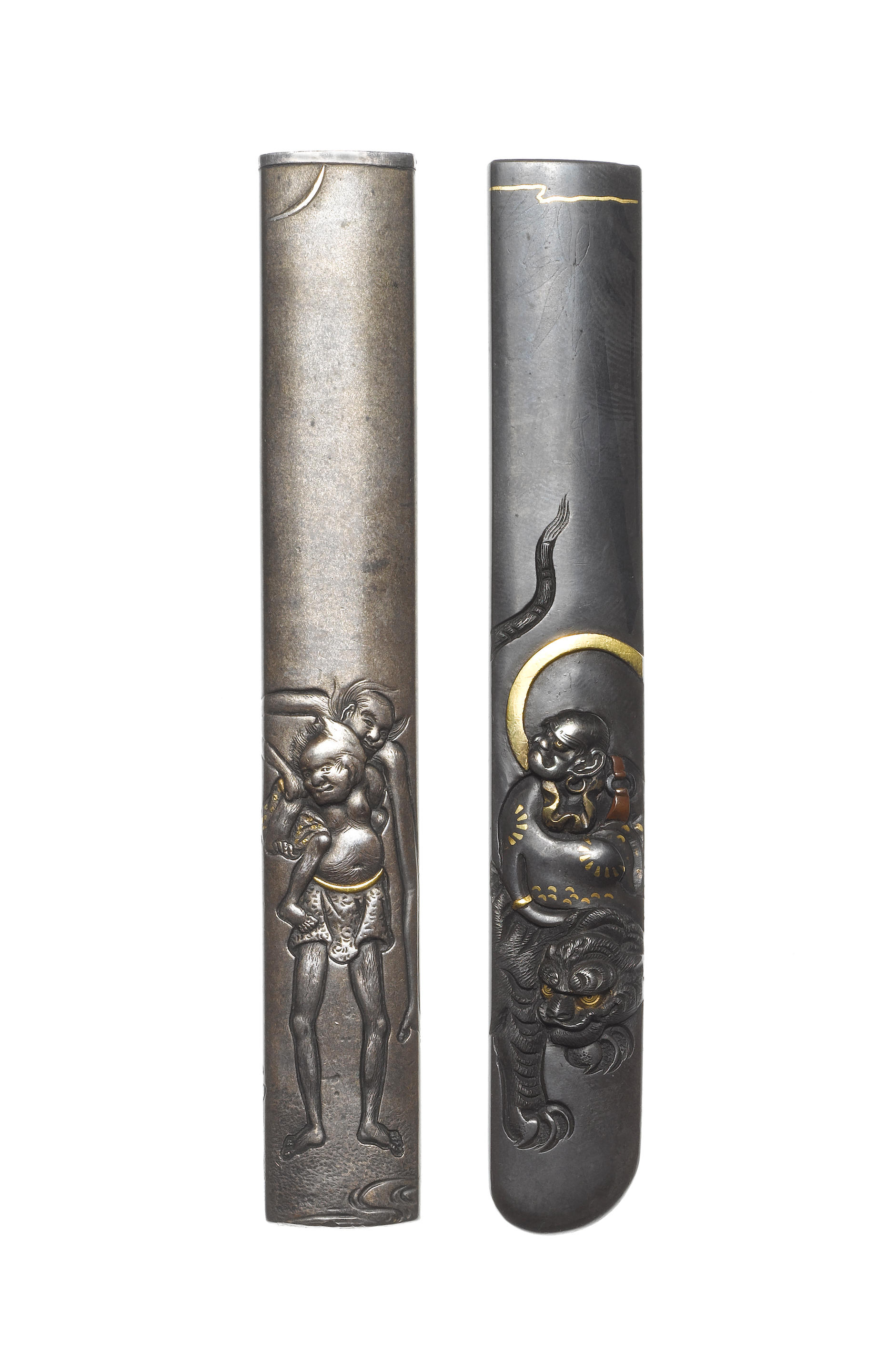 The first carved and inlaid with a rakan on a tiger, signed Hamano Masachika with kao; the second carved with Ashinaga and Tenaga, slight gold details, signed Otsuryuken. (2).