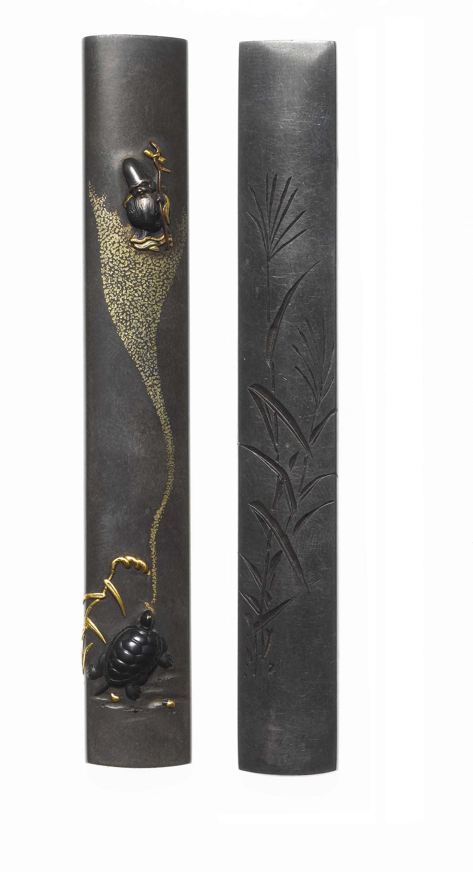 The first inlaid in iroe takazogan and splashed gold with a turtle releasing Fukurokuju on a vapour cloud, signed Haruaki with kao; the second engraved and inlaid in silver honzogan with Onna Daruma, the reverse with engraved reeds, signed Hokke with kao. (2).
