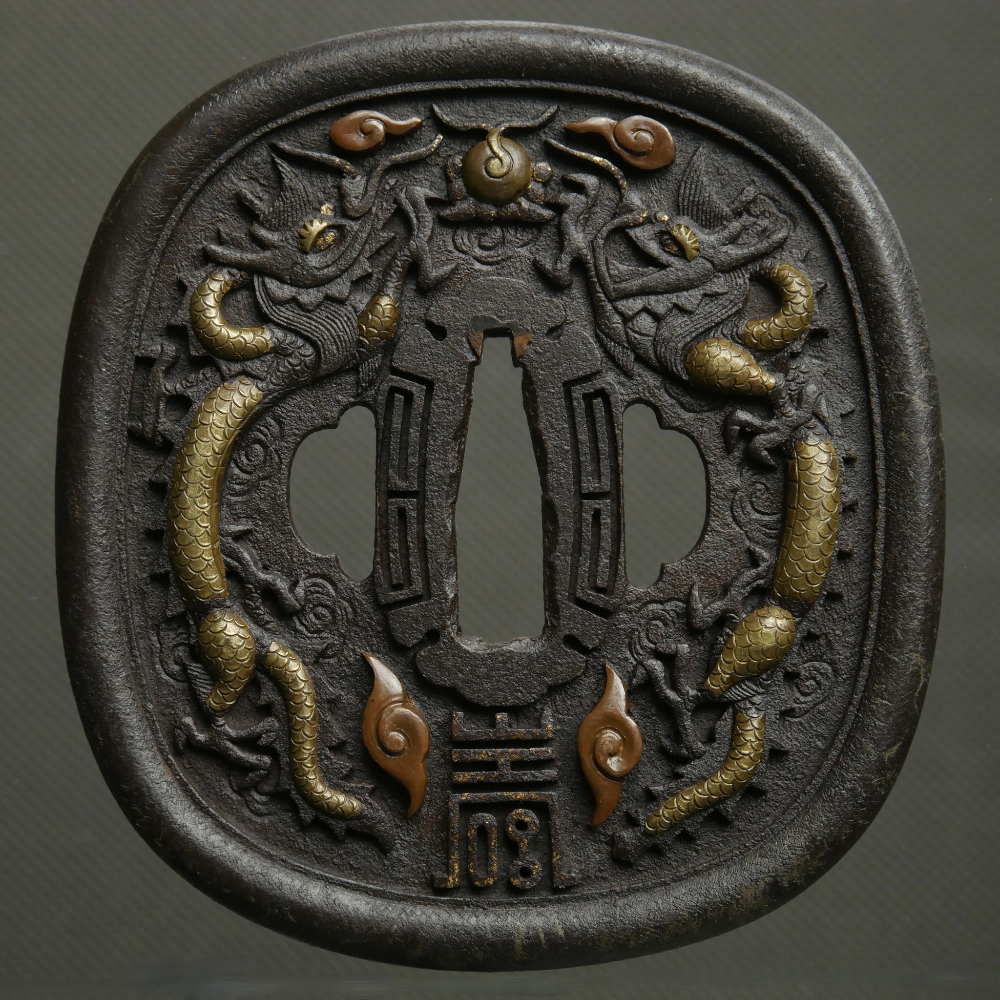 Very nice! That brass overlay we also see on Sinhalese work which made me and James Lancel McElhinney think this group of tsuba may have been from there, for the Japanese market through the VOC. This one is much more Chinese themed though than the others. Very nice piece.